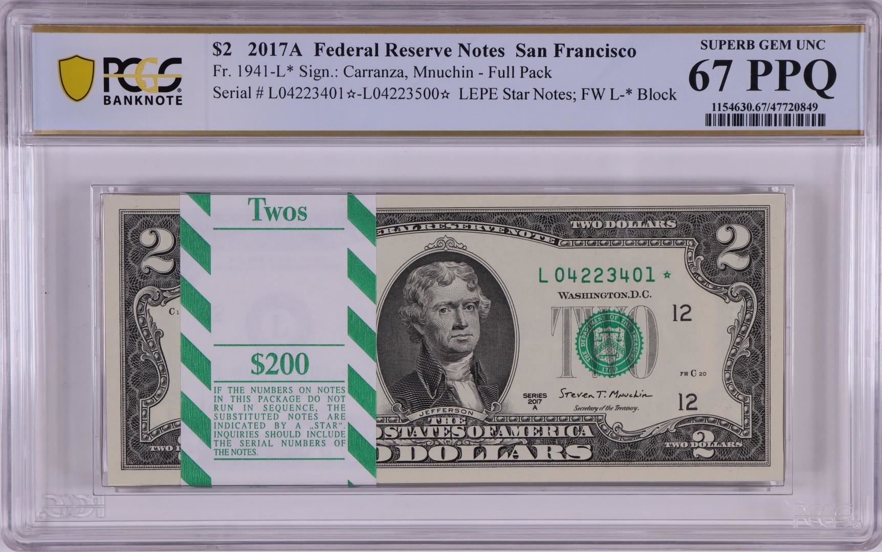 One Pack of 2017A $2 Federal Reserve STAR Notes SF Fr.1941-L* PCGS Superb Gem UNC 67PPQ. PCGS Graded.