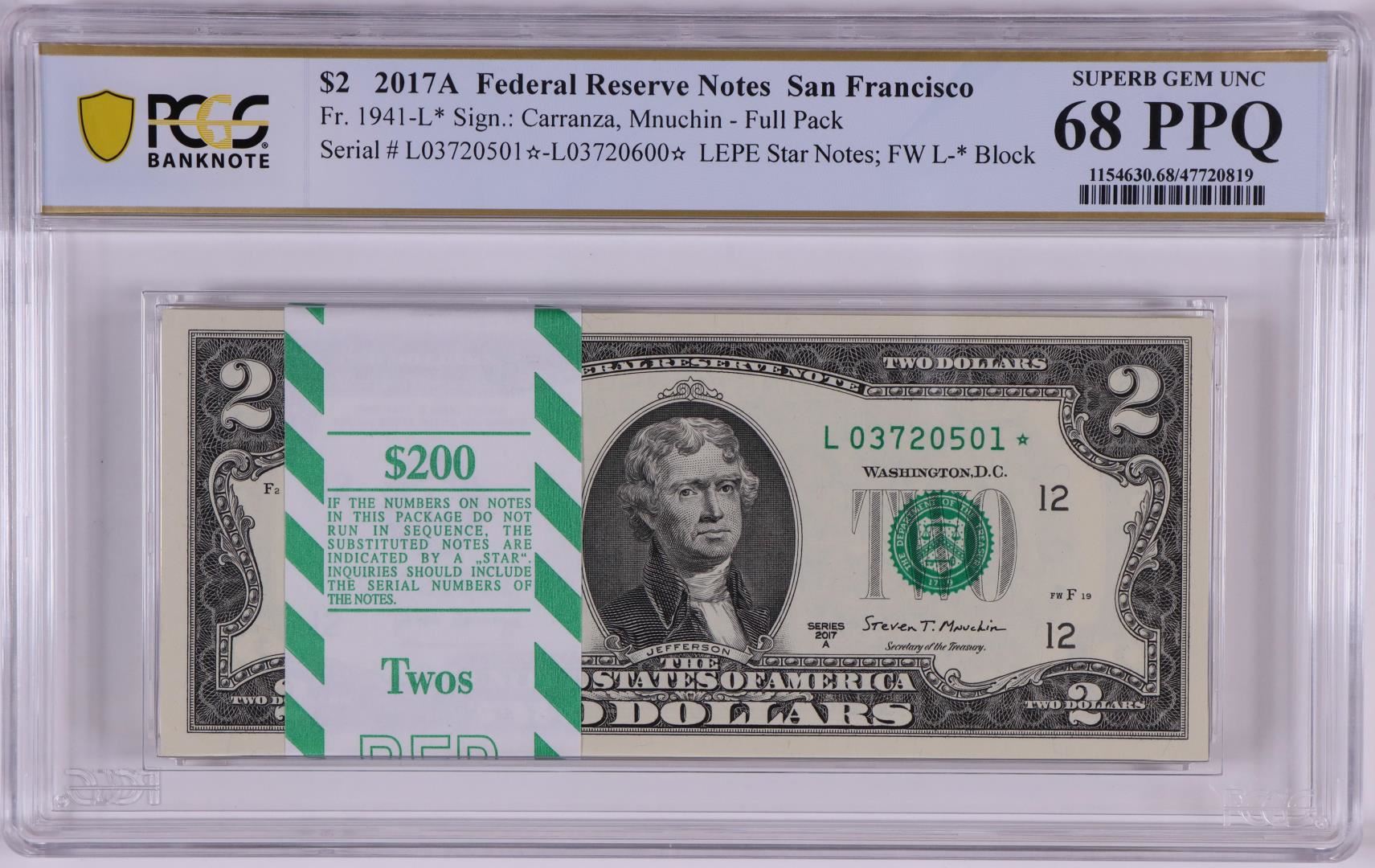 One Pack of 2017A $2 Federal Reserve STAR Notes SF Fr.1941-L* PCGS Superb Gem UNC 68PPQ. PCGS Graded.