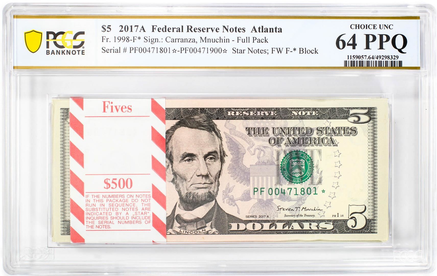 One Pack of 2017A $5 Federal Reserve STAR Notes Atlanta Fr.1998-F* PCGS Choice UNC 64PPQ. PCGS Graded.