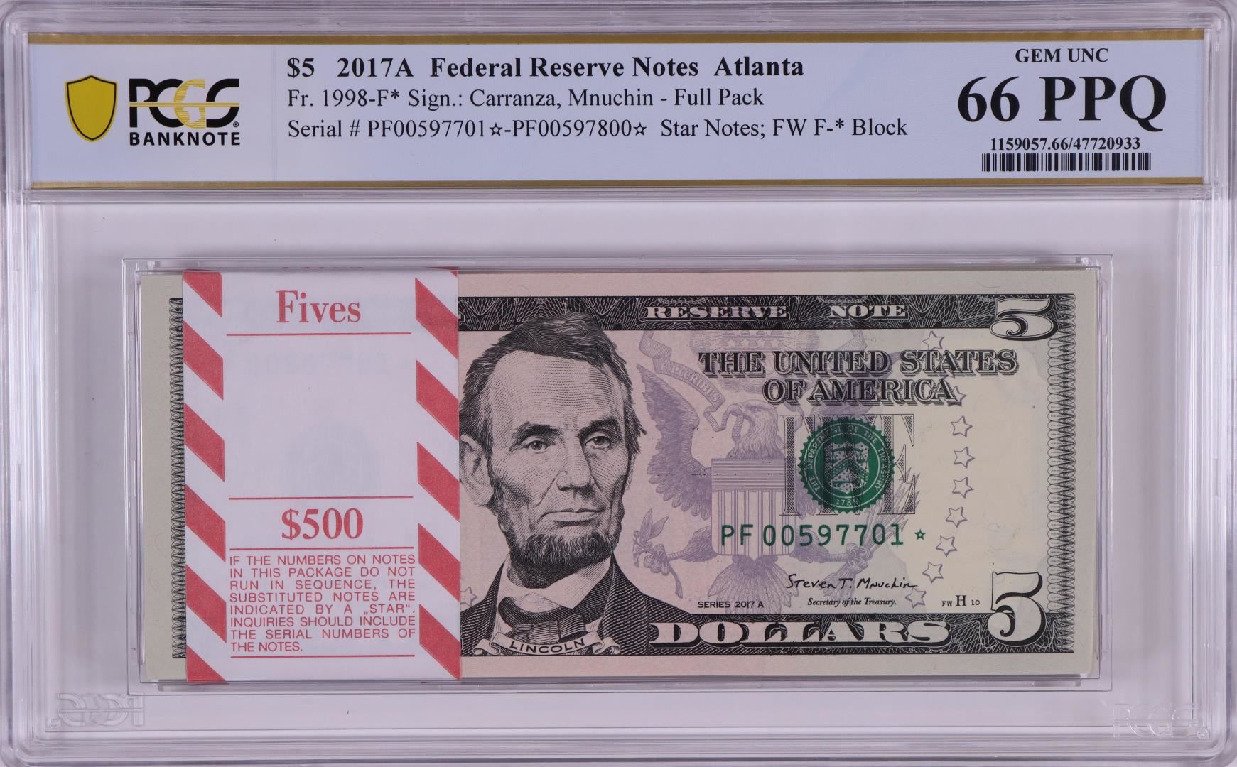 One Pack of 2017A $5 Federal Reserve STAR Notes Atlanta Fr.1998-F* PCGS Gem UNC 66PPQ. PCGS Graded.