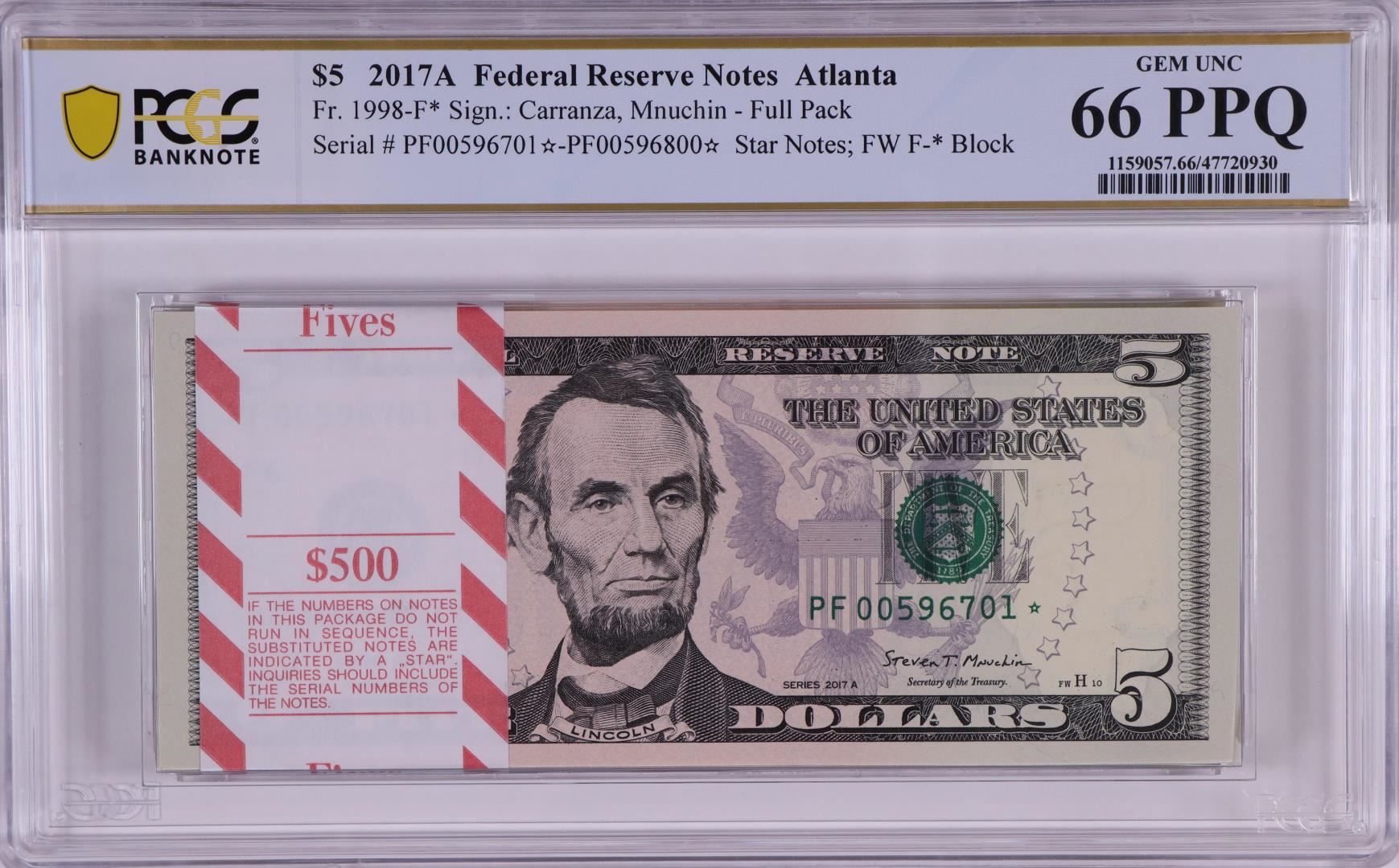 One Pack of 2017A $5 Federal Reserve STAR Notes Atlanta Fr.1998-F* PCGS Gem UNC 66PPQ. PCGS Graded.