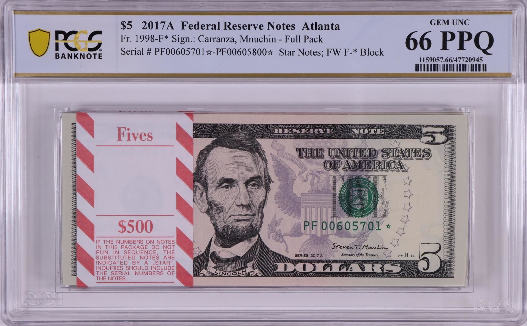 One Pack of 2017A $5 Federal Reserve STAR Notes Atlanta Fr.1998-F* PCGS Gem UNC 66PPQ. PCGS Graded.