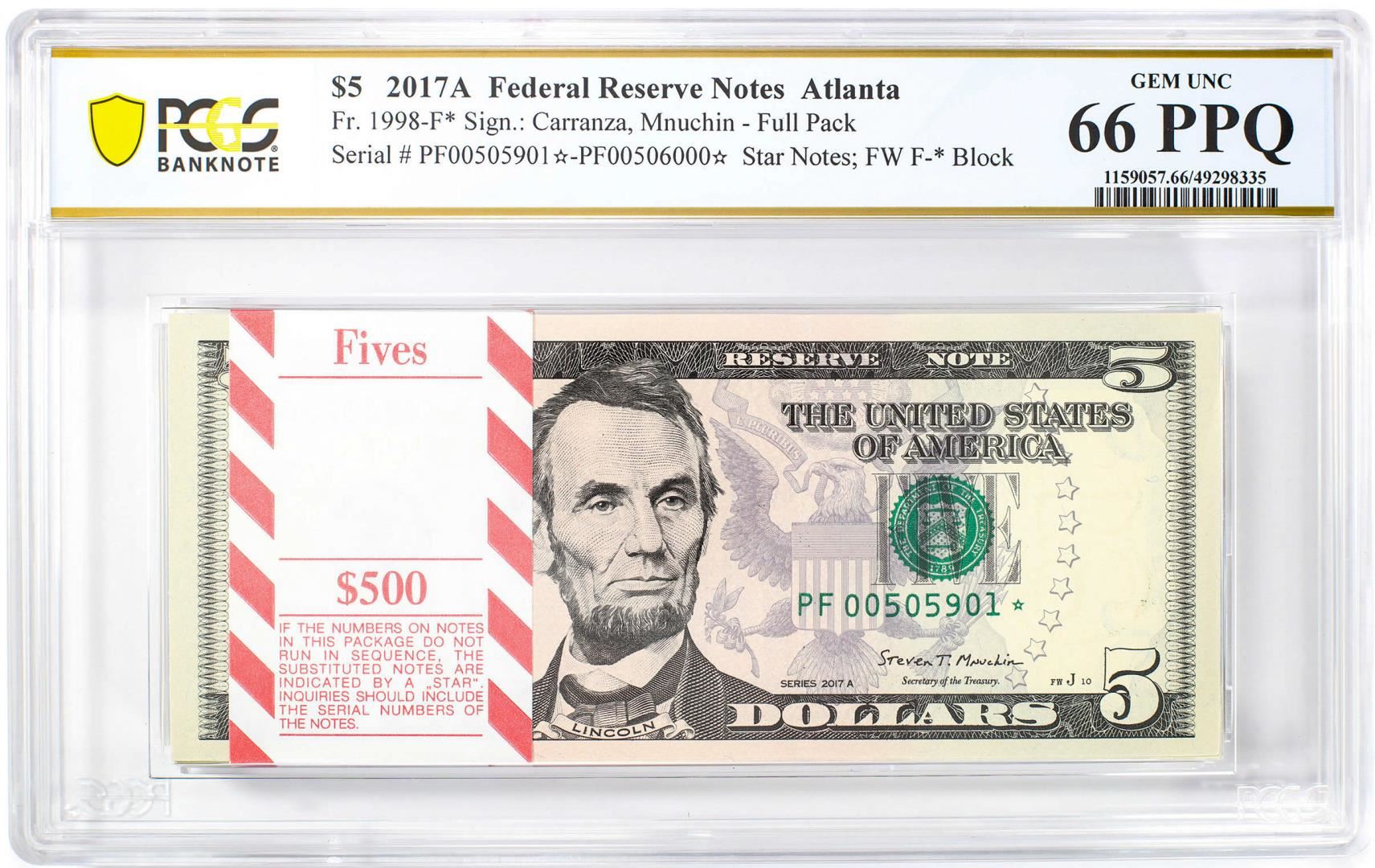 One Pack of 2017A $5 Federal Reserve STAR Notes Atlanta Fr.1998-F* PCGS Gem UNC 66PPQ. PCGS Graded.