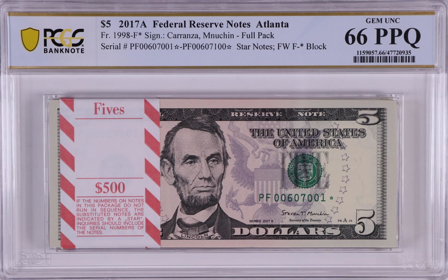 One Pack of 2017A $5 Federal Reserve STAR Notes Atlanta Fr.1998-F* PCGS Gem UNC 66PPQ. PCGS Graded.