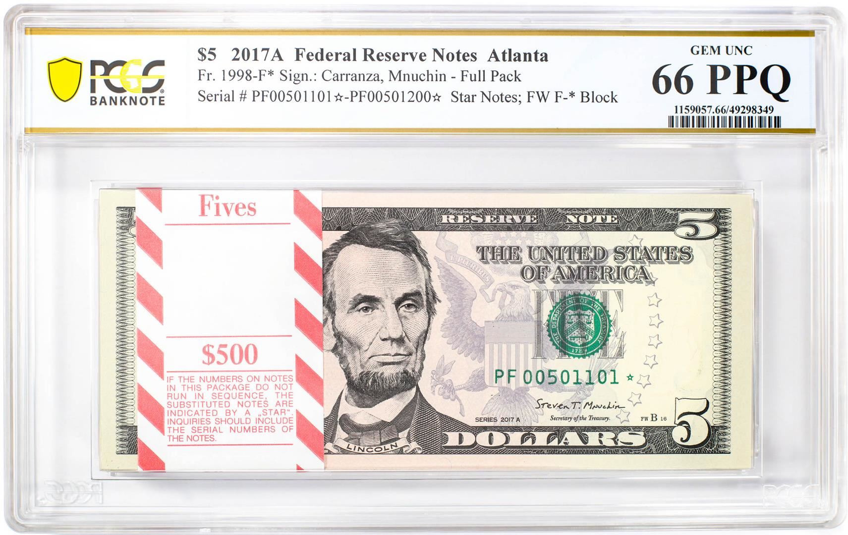 One Pack of 2017A $5 Federal Reserve STAR Notes Atlanta Fr.1998-F* PCGS Gem UNC 66PPQ. PCGS Graded.