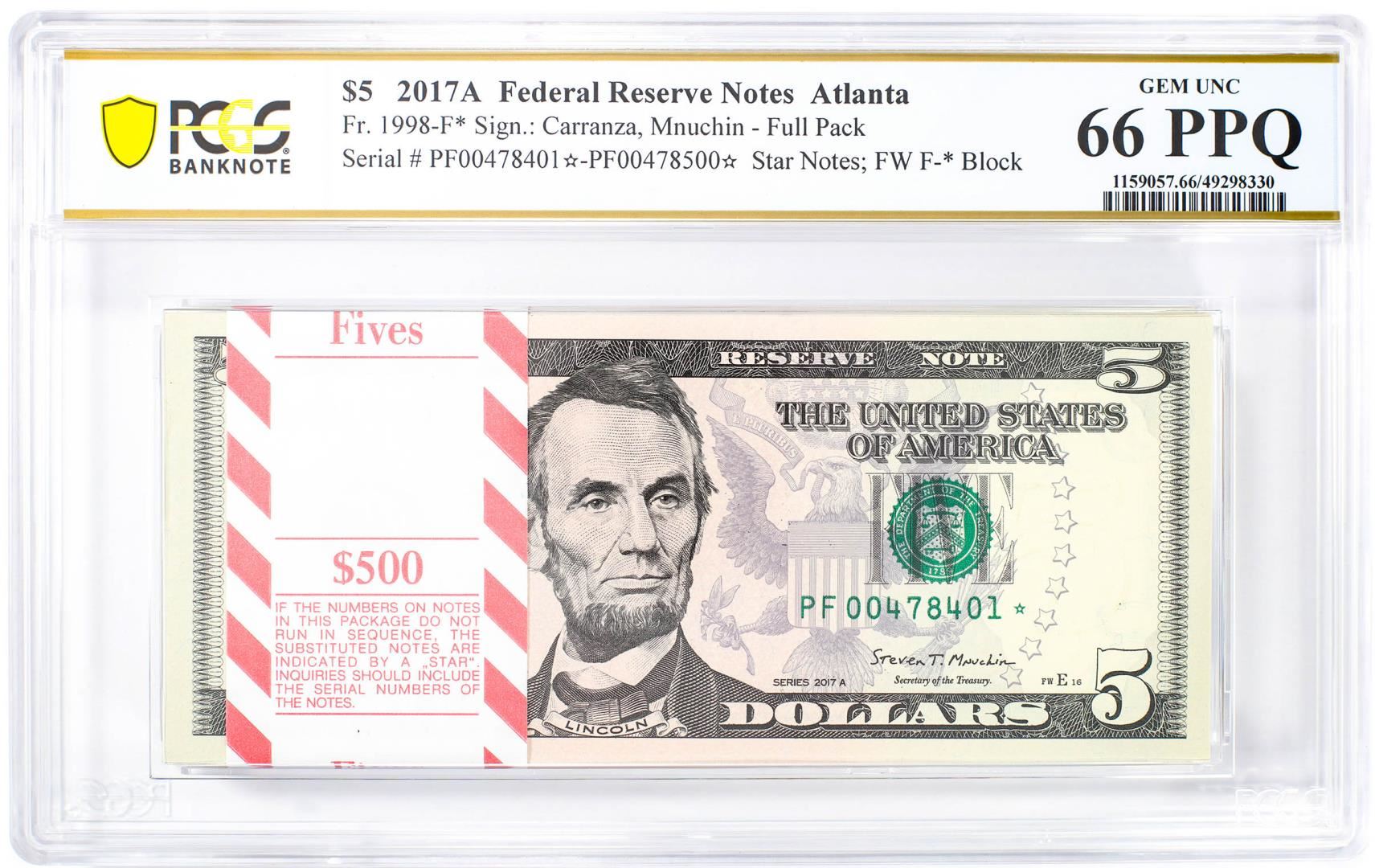 One Pack of 2017A $5 Federal Reserve STAR Notes Atlanta Fr.1998-F* PCGS Gem UNC 66PPQ. PCGS Graded.