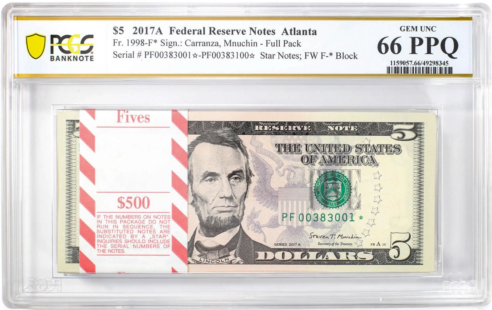 One Pack of 2017A $5 Federal Reserve STAR Notes Atlanta Fr.1998-F* PCGS Gem UNC 66PPQ. PCGS Graded.
