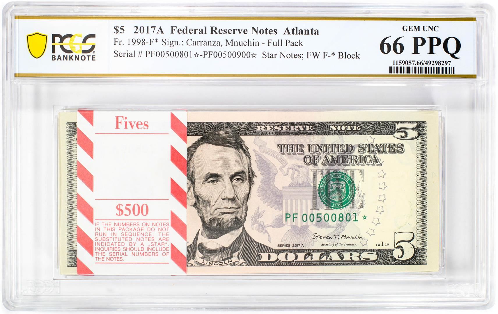 One Pack of 2017A $5 Federal Reserve STAR Notes Atlanta Fr.1998-F* PCGS Gem UNC 66PPQ. PCGS Graded.