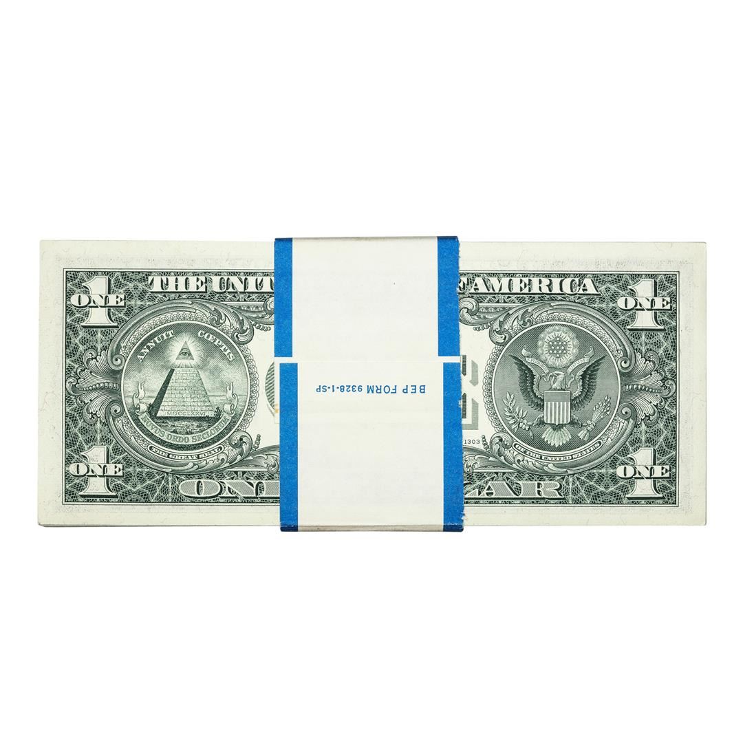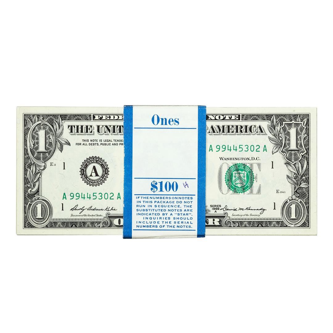 One Pack of (99) Consecutive 1969A $1 Federal Reserve Notes Boston, please note that original bank strap is included and says $100 but this lot is missing the first note and only contains (99) notes.