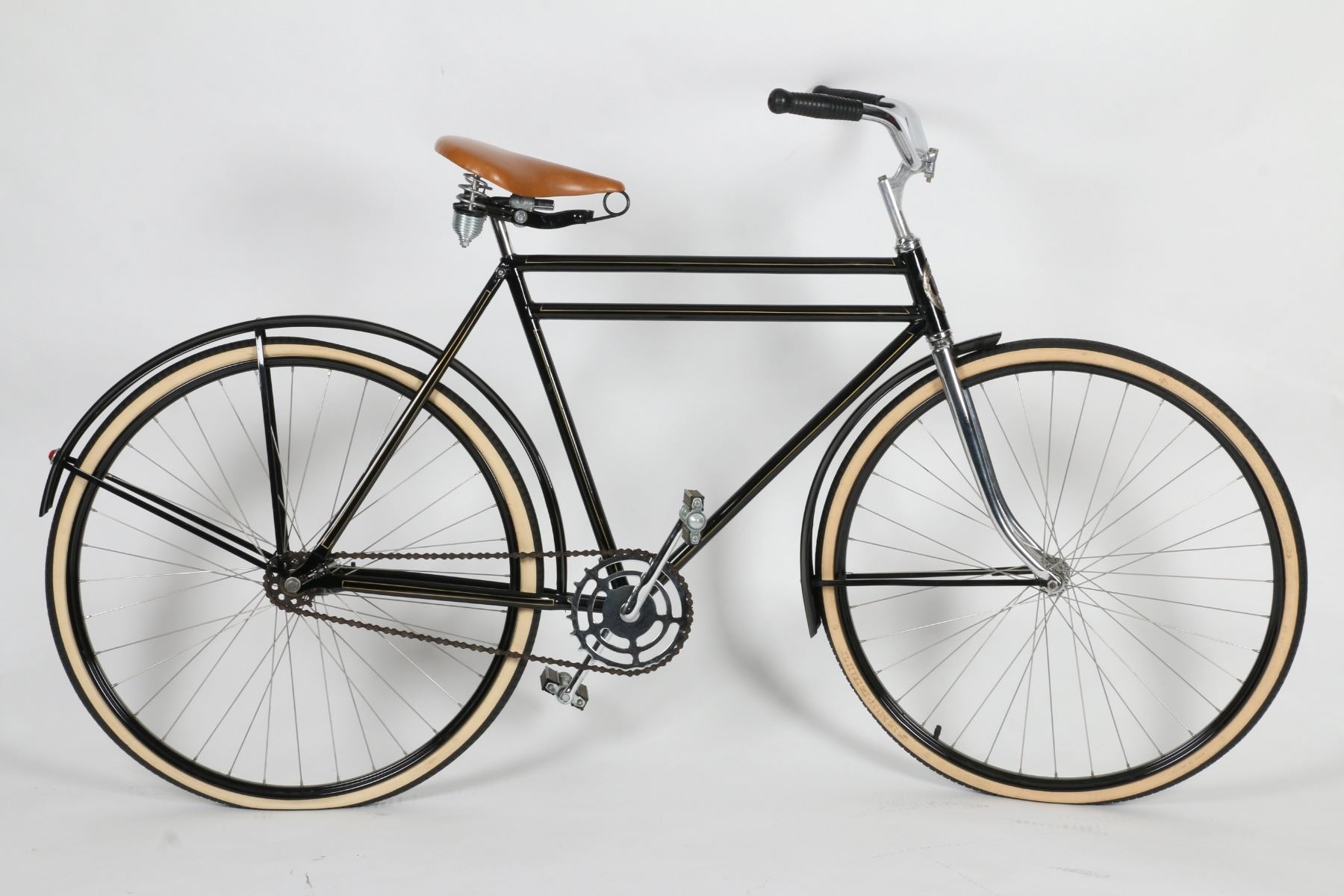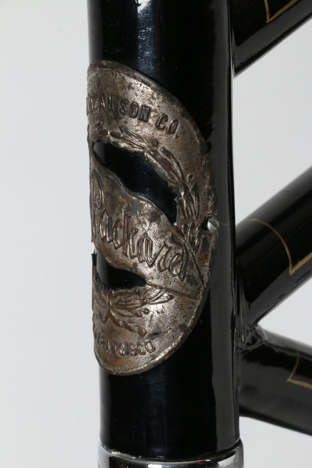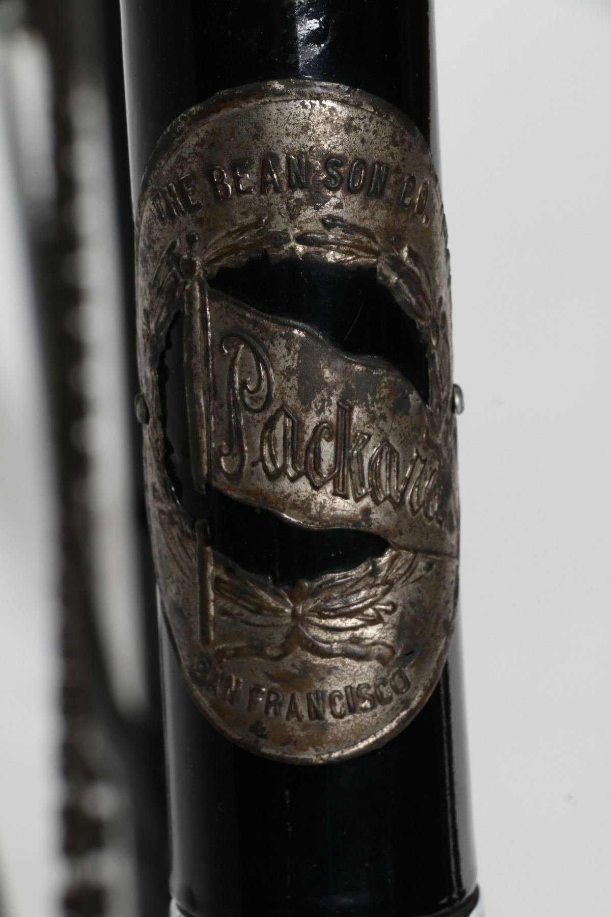 American. San Francisco. 1920s. The Bean Son Company. It was popular for companies to brand bicycles in association with prestigious automakers. The aluminum "gooseneck" holding the handlebar resembles the lines of the cormorant features, as on Packard hood ornaments of the same era. 70" x 39" x 12". Meticulously restored. Retains original name badge. 800-1200.