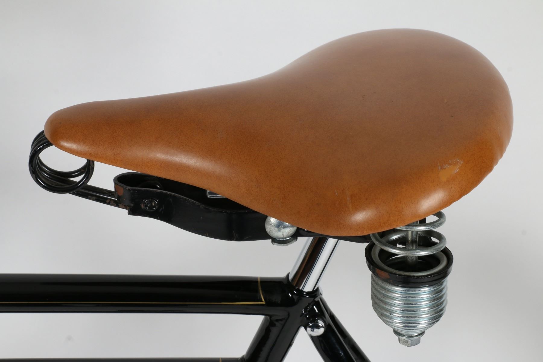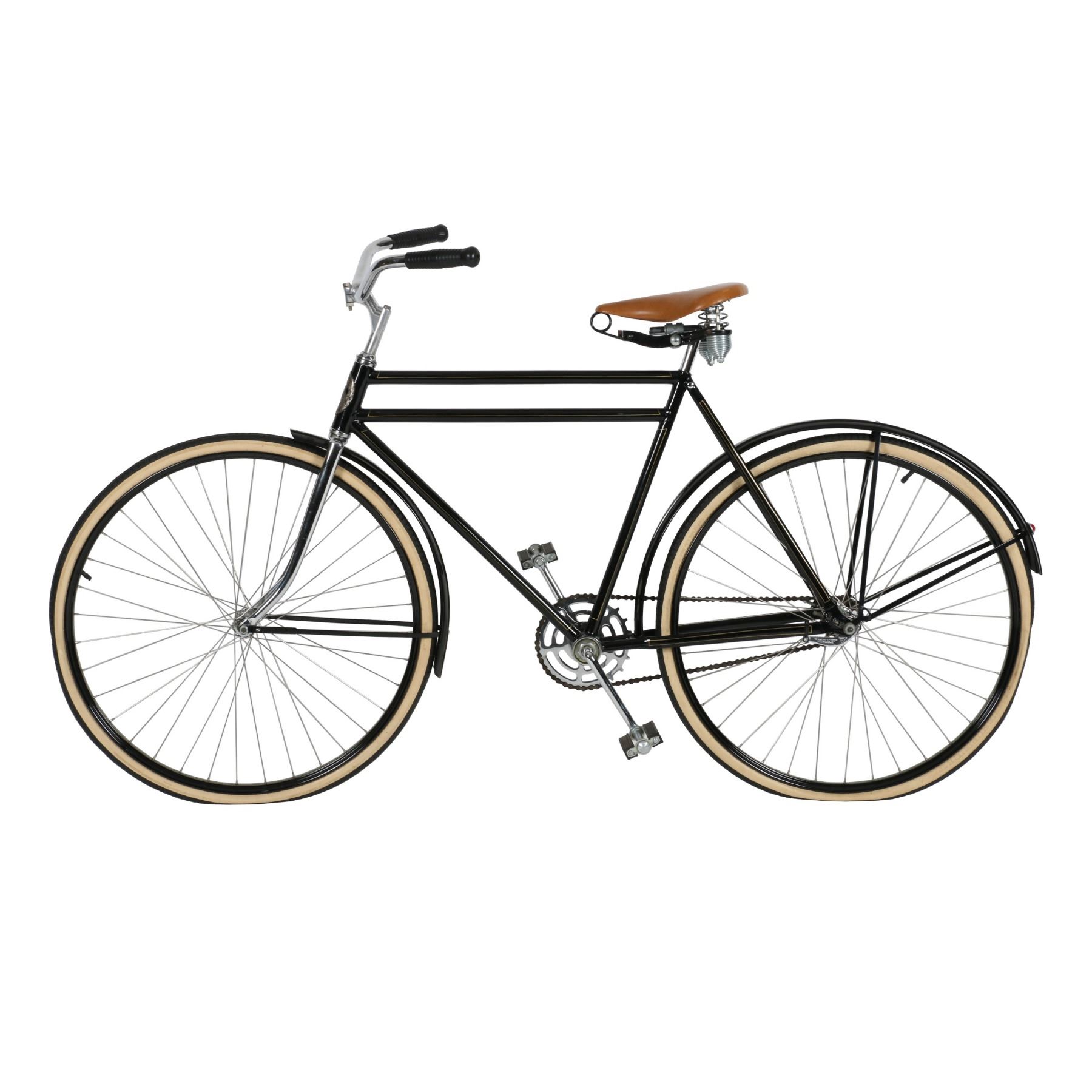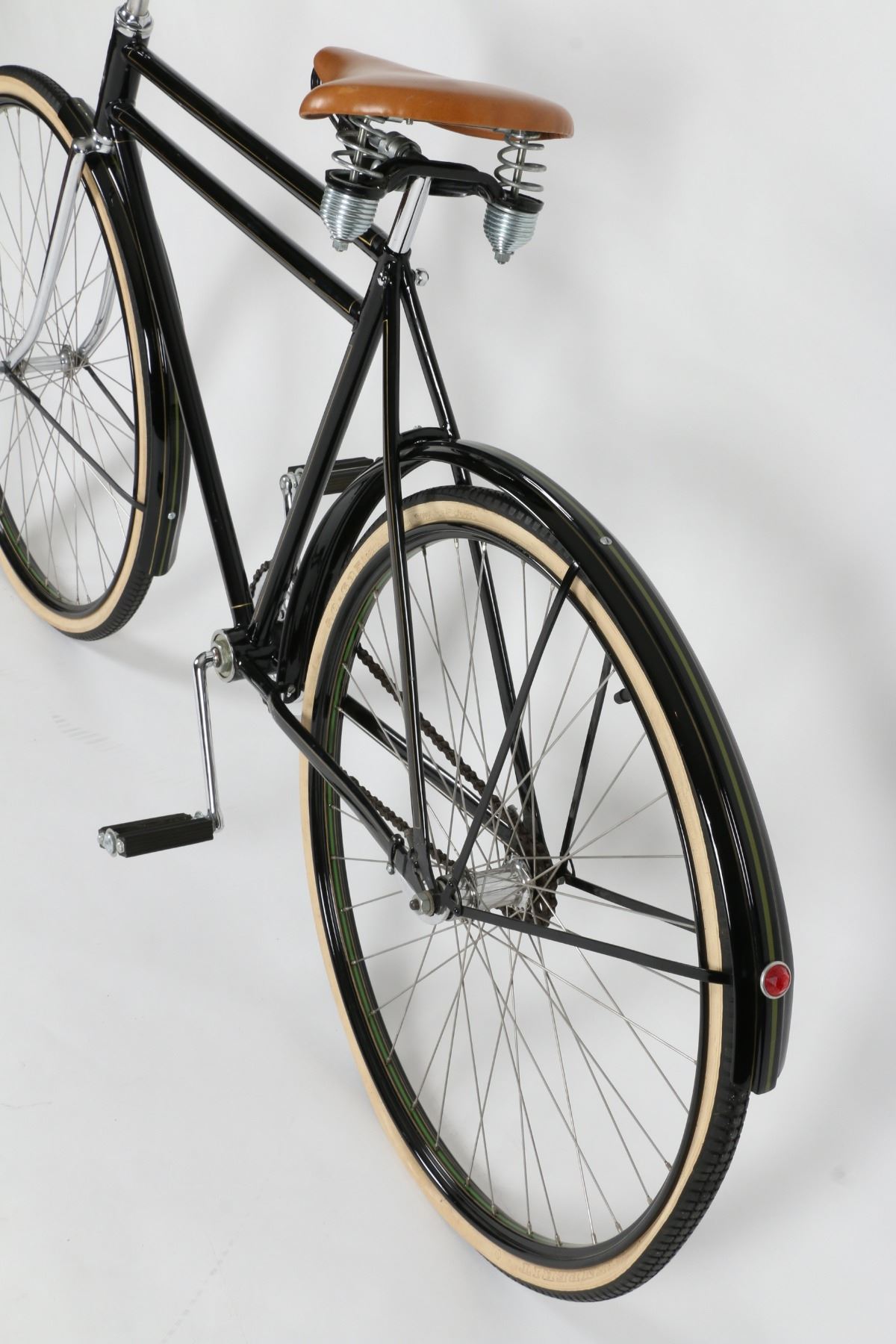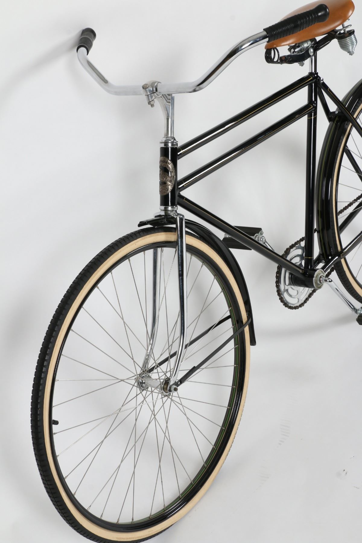 American. San Francisco. 1920s. The Bean Son Company. It was popular for companies to brand bicycles in association with prestigious automakers. The aluminum "gooseneck" holding the handlebar resembles the lines of the cormorant features, as on Packard hood ornaments of the same era. 70" x 39" x 12". Meticulously restored. Retains original name badge. 800-1200.