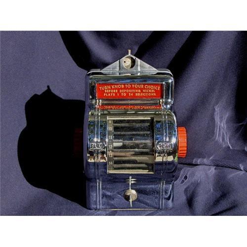 Packard "Butler" Chrome Wallbox, made by the Packard Mfg. Co. in the 1940's. This is a prewar unit that takes nickels. This wallbox was made to go with the Packard Pla-Mor in 1946 and the Manhatten in 1947. Since these two were only manufactured for two years, they were made as a universal wallbox to be used with most of the other 24 play jukeboxes. The Packard Mfg. Co. was formed by Homer Capehart in 1932, but produced nothing until 1940 because Homer worked for Wurlitzer. The "Butler" was produced for nine years, along with the two styles of jukeboxes and other ornate speakers. In 1951 Wurlitzer bought all of Packards assets and shelved them. This wallbox is all original. The condition is very good, with the exception of one hole (cigarette burn?) in one of the red turn knobs. The title selection strips are absent, but are easy to replace. This unit weighs in at ten pounds. The key is included. This will make a wonderful addition to someones collection. See photos. Take a glance at my other items. Thank you for viewing.