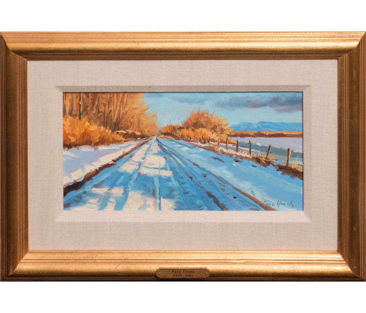 Paco Young (1958 - 2005). Winter Trails. 8" x 16" oil on canvas. Signed lower right: Paco Young. 1998 C. M. Russell Auction Quick Draw entry. Provenance: Estate of Ken Holm, Denver, CO.