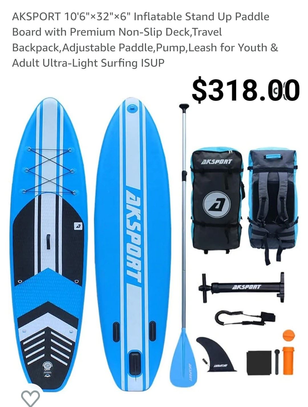 Inflatable 10'6" stand-up paddleboard with non-slip deck, includes paddle, pump, leash, and carrying backpack, new.
