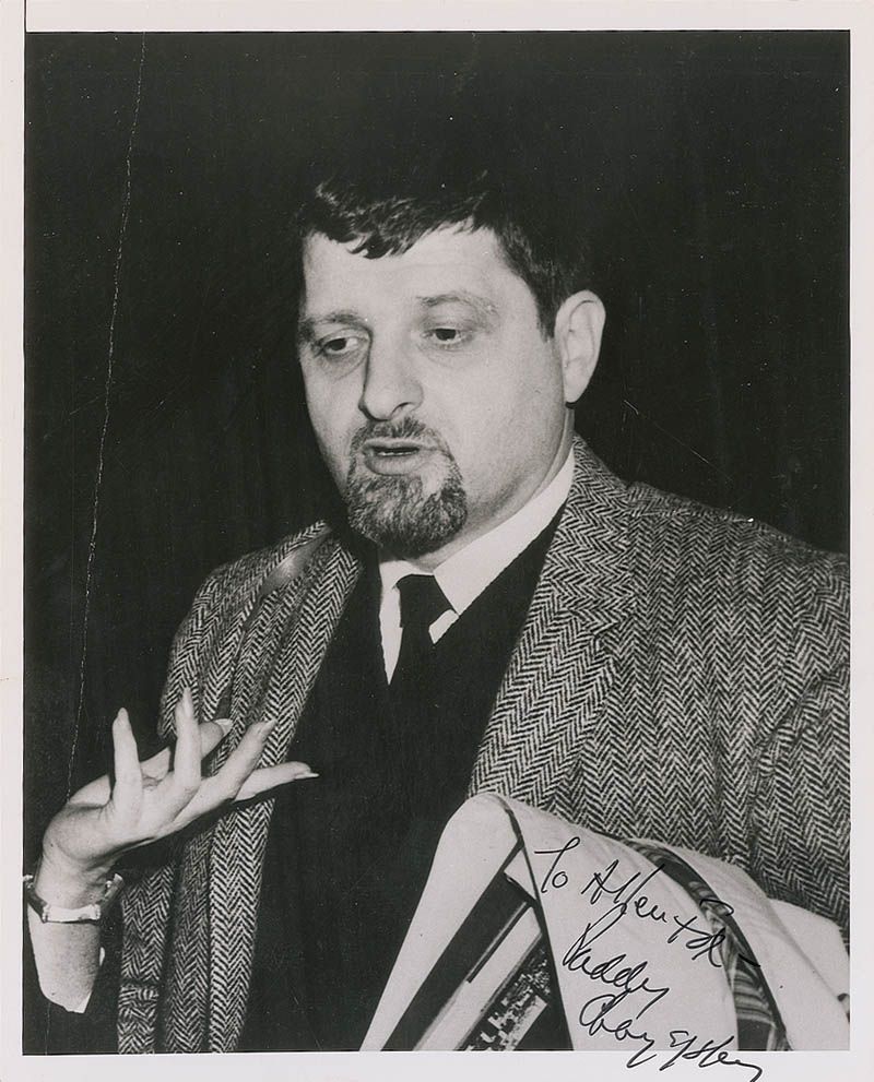 American playwright and screenwriter. He won Academy Awards for Marty (1955) and Hospital (1971). Glossy 8 x 10 photo, signed and inscribed in black felt tip “To Allen Fox, Paddy Chayefsky.” In very good condition, with a noticeable vertical crease to left side and some scattered light surface marks and dings.
