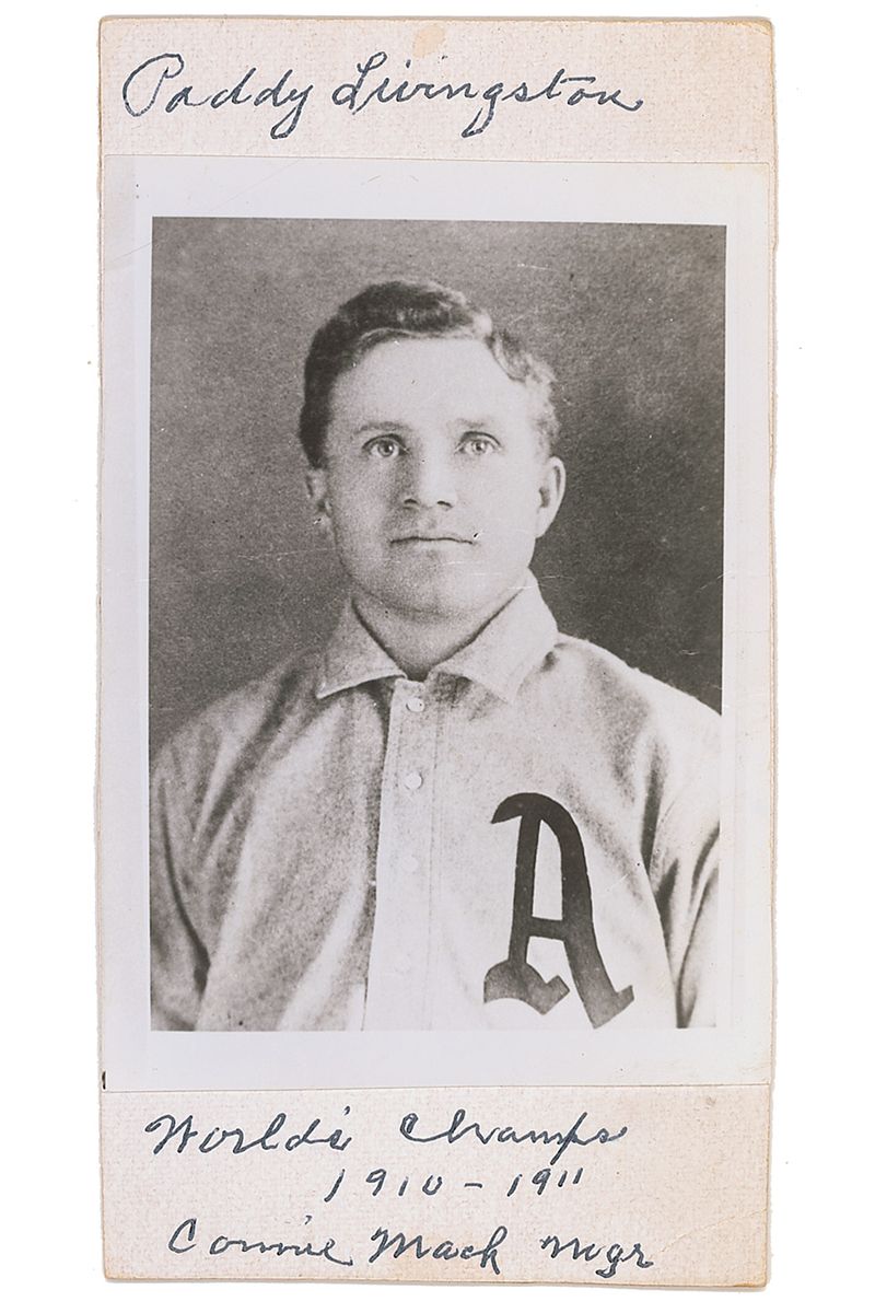 Catcher (1880–1977) who played for seven seasons in the Major Leagues. He was also the last survivng player of the inaugural year for the American League. Ballpoint signature, “Paddy Livingston, World’s Champs 1910–1911, Connie Mack mgr,” on an off-white 3 x 6 card, with a glossy photo of Livingston affixed to the center of the card. In fine condition, with a few creases to card and some heavier creases to photo.