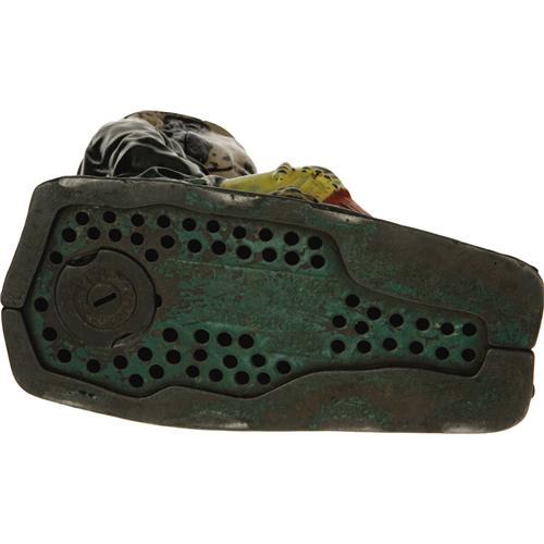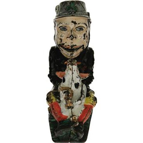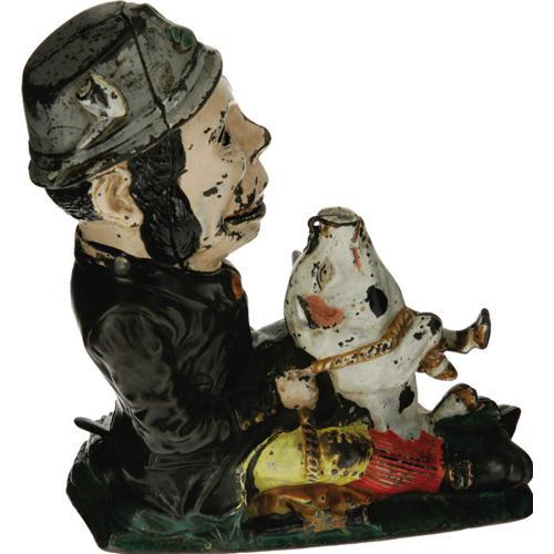 <B>Paddy and the Pig Mechanical Bank</B></I> manufactured by J. & E. Stevens appears here with the Irish Paddy trying hard to restrain his pig. When a coin is placed on the pig's nose and the trip is activated, the pig kicks the coin onto Paddy's tongue which quickly retracts taking the coin in while his eyes roll. Overall the paint is very good, with wonderful features in an almost comic exaggeration. Complete and appearing all original, this bank makes a lasting impression. 8" high x 7" long x 4" wide.