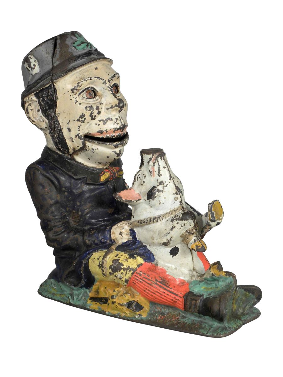 Cast Iron Mechanical Bank, entitled "Paddy and the Pig", patented 1875. Some normal played with wear otherwise good working condition, 85% of original paint intact. 7 X 8 X 3 1/2 inches.