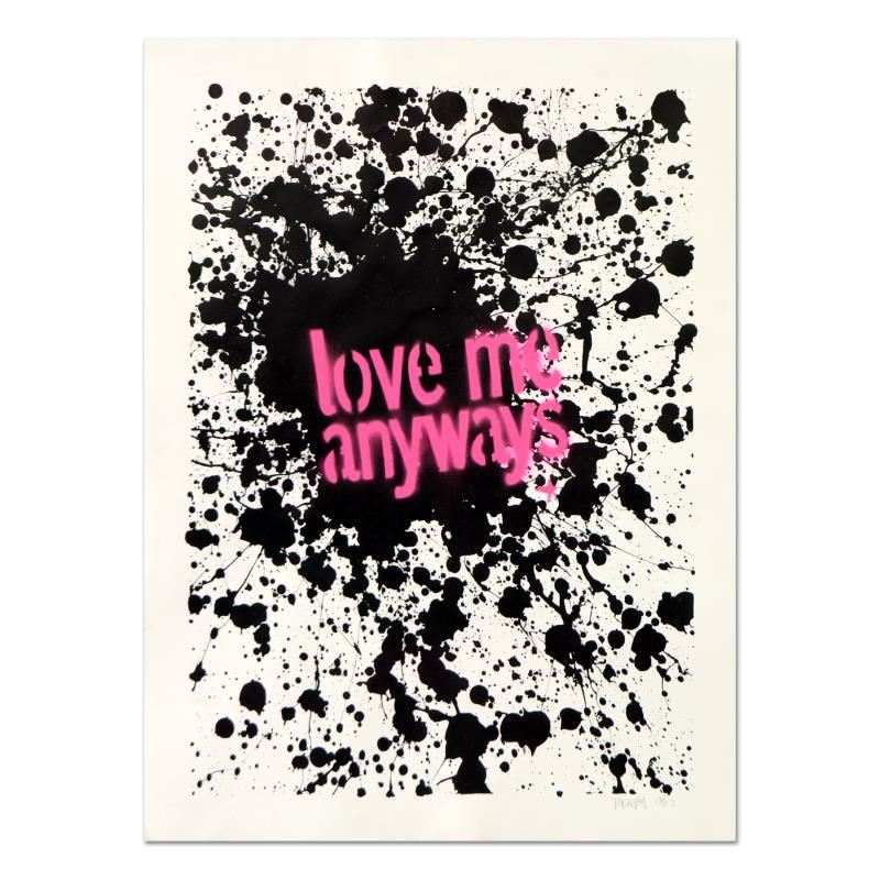 "Love Me Anyways" is a hand painted unique variation silkscreen on archival paper numbered 9/12 hand signed by the artist. Includes Letter of Authenticity. Measures approx. Measures approx. 18" x 24" (image).