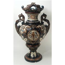 Színesen festett fajansz, domborított díszítéssel, figurális füllel. Szájperemén kopott, egyik füle ragasztott. Magyar, XIX. sz. vége, M.: 56 cm