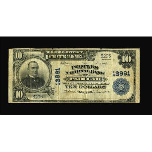 <B>Paducah, KY</B></I> - $10 1902 Plain Back Fr. 635 <B>The Peoples NB</B></I> Ch. # 12961<BR> Moderate, but even wear is noted on this issue from the Blue Grass state. Some notches are noted in the margins at the folds. <B>Fine.</B></I><BR><BR><b>Shipping:</b> Coins & Currency (<a target="_blank" href="http://www.heritageauctions.com/common/shipping.php">view shipping information</a>)