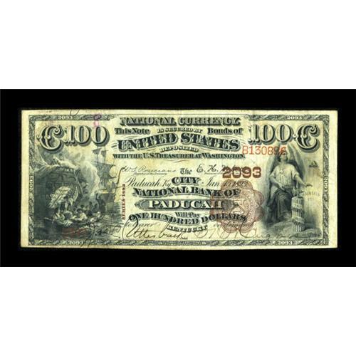 <B>Paducah, KY</B></I> - $100 1882 Brown Back Fr. 525 <B>The City NB</B></I> Ch. # 2093<BR> This is the most common Paducah bank, but hardly in this type and denomination, as this is the only $100 Brown Back recorded in the census from here, or any other Paducah bank for that matter. It's one of the most appealing examples of this rare type we've seen from any Kentucky issuer, with even circulation, bright colors, and strong pen signatures. <B>Fine-Very Fine,</B></I> a lot closer to the higher grade than the lower.<BR><BR><b>Shipping:</b> Coins & Currency (<a target="_blank" href="http://www.heritageauctions.com/common/shipping.php">view shipping information</a>)