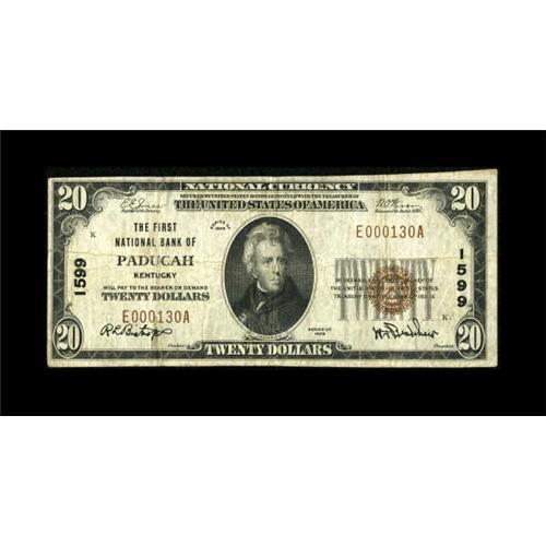 <B>Paducah, KY</B></I> - $20 1929 Ty. 1 <B>The First NB</B></I> Ch. # 1599<BR> Only seven small size are known for this institution. Some embossing remains visible<B>. Fine+.</B></I><BR><I>From The Kansas City Collection.</B></I><BR><BR><b>Shipping:</b> Coins & Currency (<a target="_blank" href="http://www.heritageauctions.com/common/shipping.php">view shipping information</a>)