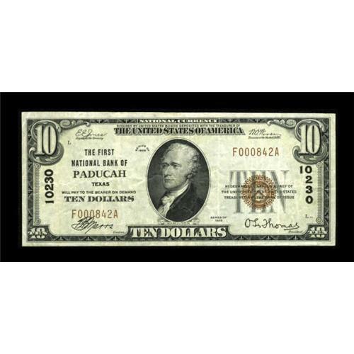 <B>Paducah, TX</B></I> - $10 1929 Ty. 1 <B>The First NB</B></I> Ch. # 10230<BR> A high grade example from this one bank west Texas community which is in fact the nicest Series 1929 note known from here. <B>Very Fine+,</B></I> ex- Jeff Poyer collection sale in 2003. <BR><BR><b>Shipping:</b> Coins & Currency (<a target="_blank" href="http://www.heritageauctions.com/common/shipping.php">view shipping information</a>)