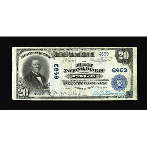 <B>Page, ND</B></I> - $20 1902 Plain Back Fr. 650 <B>The First NB</B></I> Ch. # 6463<BR>A truly rare note in large size, with the census showing just four such examples, with this the equal of any in grade and the sole $20 as well. Bright <B>Very Fine,</B></I> with vibrant two color signatures and great eye appeal.<BR><BR><b>Shipping:</b> Coins & Currency (<a target="_blank" href="http://www.heritageauctions.com/common/shipping.php">view shipping information</a>)