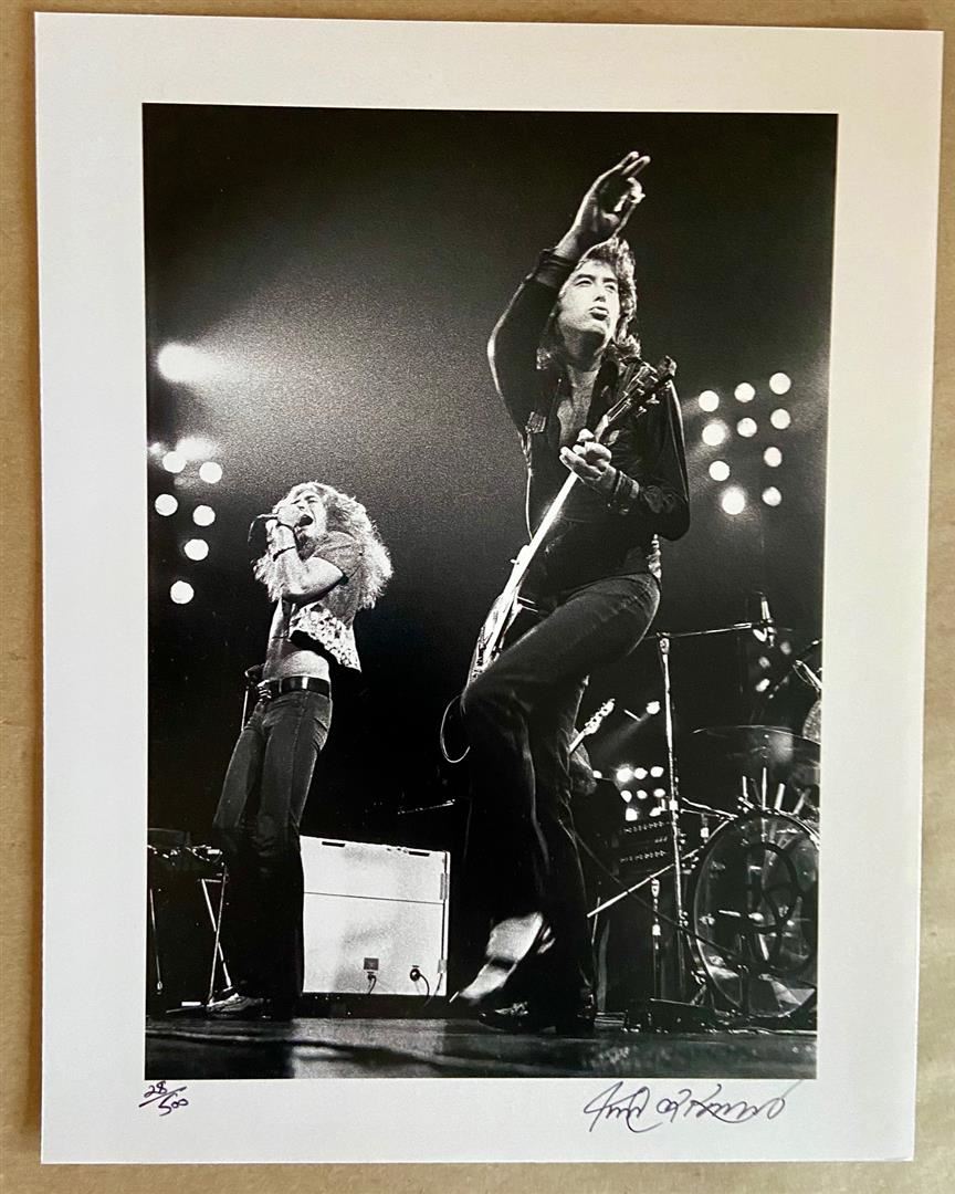 Robert Plant, Jimmy Page on stage with the Zeppelin 12969 Honolulu. Signed by famed "Rock Gods" photographer Robert M. Knight 14x11"