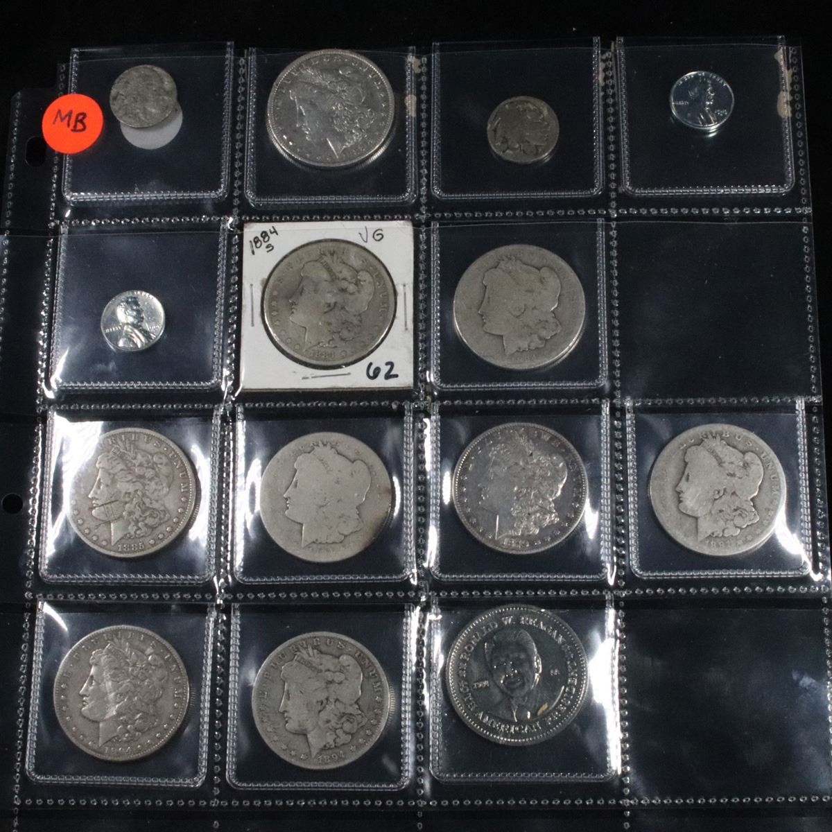 Page of 14 Mixed coins Morgan $1, Buffalo 5c, Lincoln 1c . .. A nice page of a wide variety of 20 coins. This page includes 1896-o Morgan, 1904-s Morgan, 1894-o Morgan, 1885-o Morgan, 1894-s Morgan, 1879-s Morgan, 1891-o, 1884-s Morgan, 1894-o Morgan, 1889-o Morgan, 2 No Date Buffalo Nickels, 1943-s Steel Cent, 1984 Ronal Reagan Commemrotive and a 1960-d Lincoln