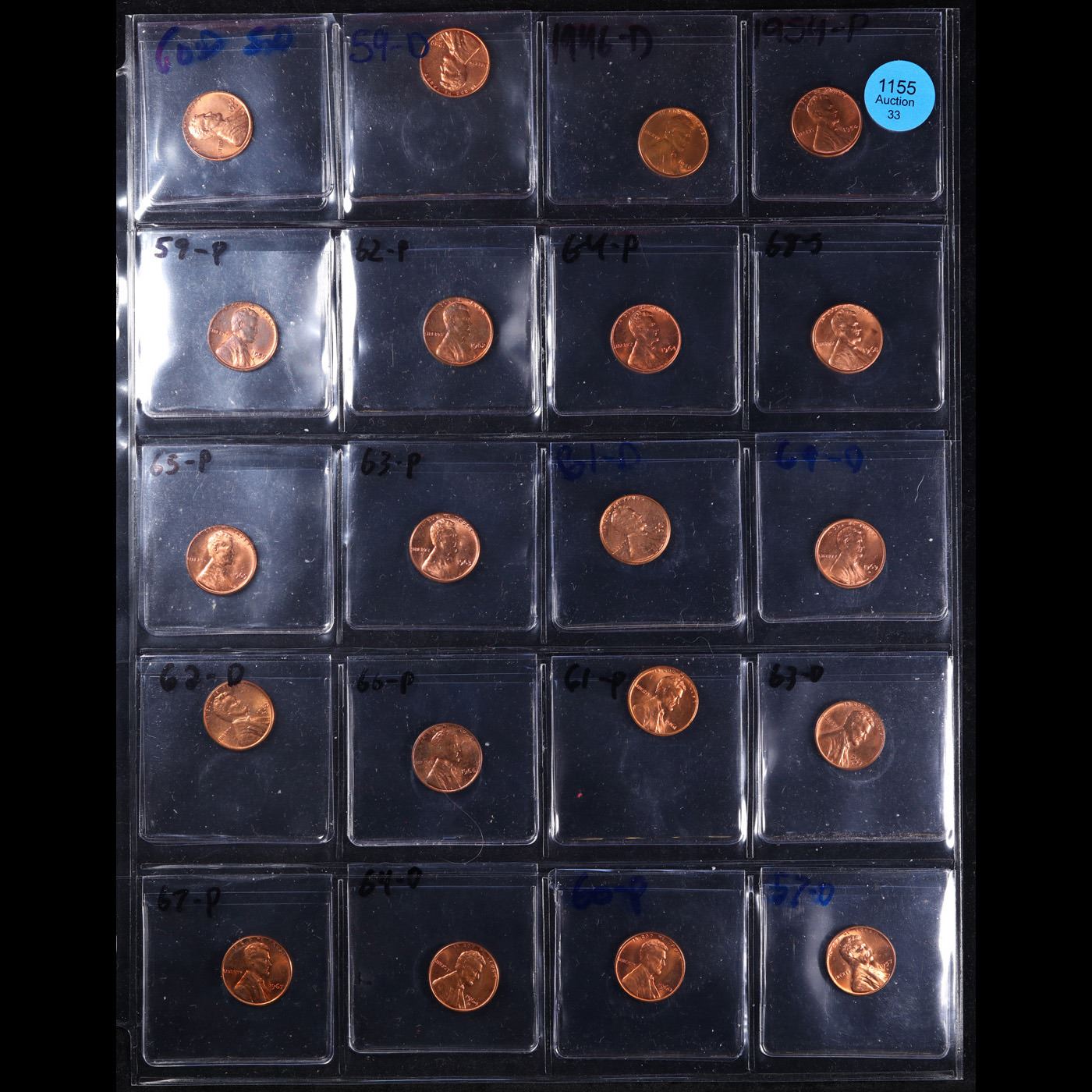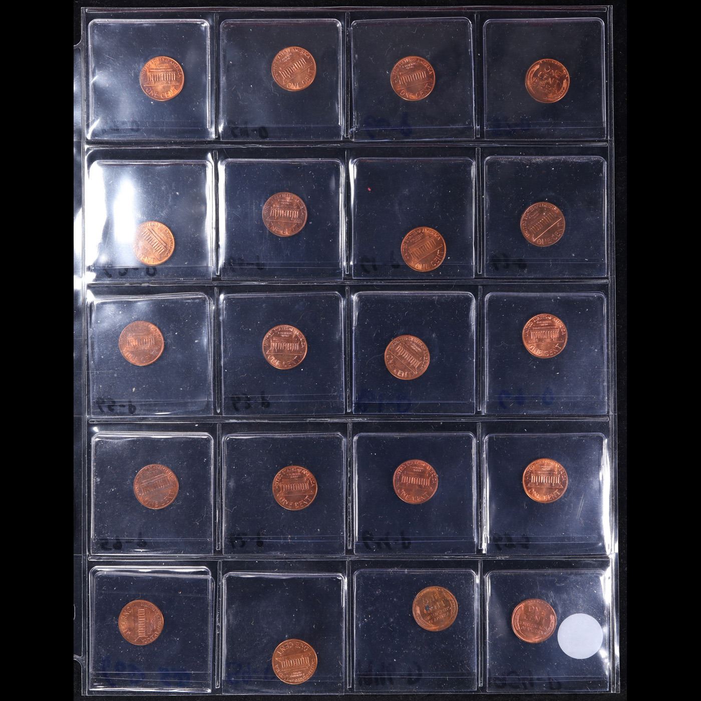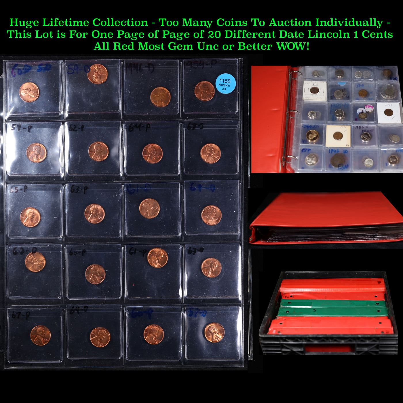 Page of 20 Different Date Lincoln Cents All Red, Most Gem! UNC or Better - Huge Liifetime Collection - Too Many Coins To Auction Individually. 0 We have received a huge collection of over 10 thousand US coins in flips, 2x2 holders, and 20 coin pages. We are forced, due to limited lots, to sell this collection in pages of 20 coins. This Lot is for 1 Page of 20 Lincoln Cents All Different Dates All Red, Most Gem! UNC or Better These pages could not be reviewed by anyone in our office due to time constraints. We estimate the value of each page to meet or exceed $200 in value! Good luck and happy hunting.