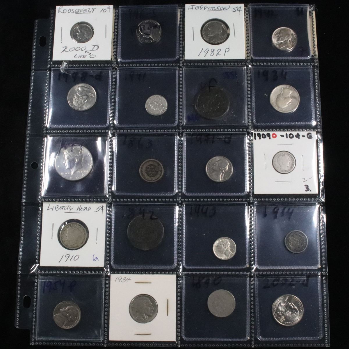 Page of 20 Mixed coins Barber 10c, Braided Hair 1c, Washington 25c, Liberty 5c, Indian 1c, Buffalo 5c. A nice page of a wide variety of 20 coins. This page includes 2000-d Roosevelt Dime, 1996-s Proof Jefferson Nickel, 1982-p Hefferson Nickel, 1942-p Jefferson Nickel, 1998-d Washington Quarter, 1941-p Mercury Dime, 1851 Braided Hair, 1934-p Washington Quarter, 1964-p Kennedy Galf, 1863 Indian Cent, 1971-d Jefferson Nickel, 1909-o Barber Dime, 1910 Liberty Nickel, 1842 Braided Hair, 1943-p Mercury Dime, 1914-p Barber Dime, 1954-p Jefferson Nickel, 1934-p Buffalo Nickel, 1890 Liberty Nickel, and 2002-d Washington Quarter