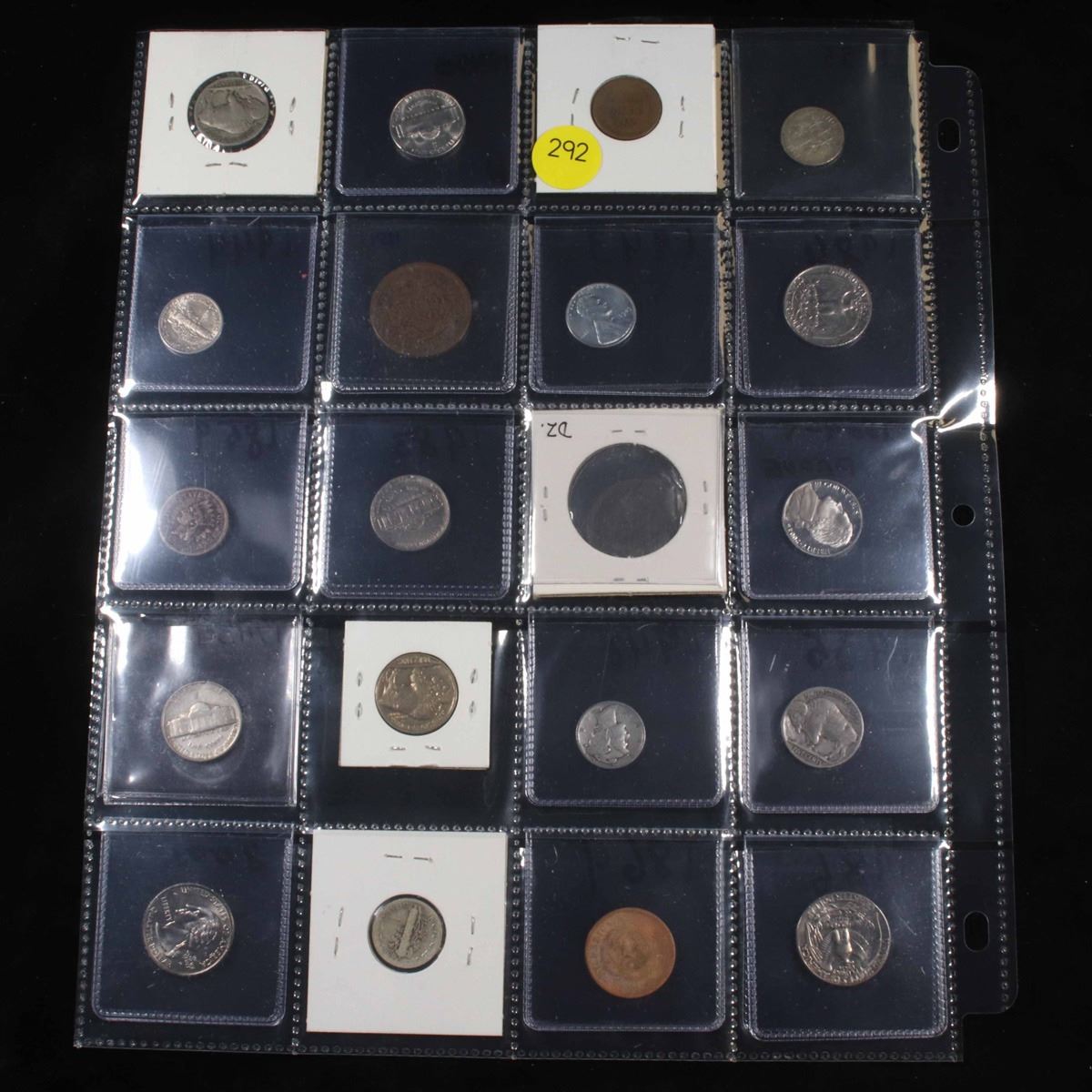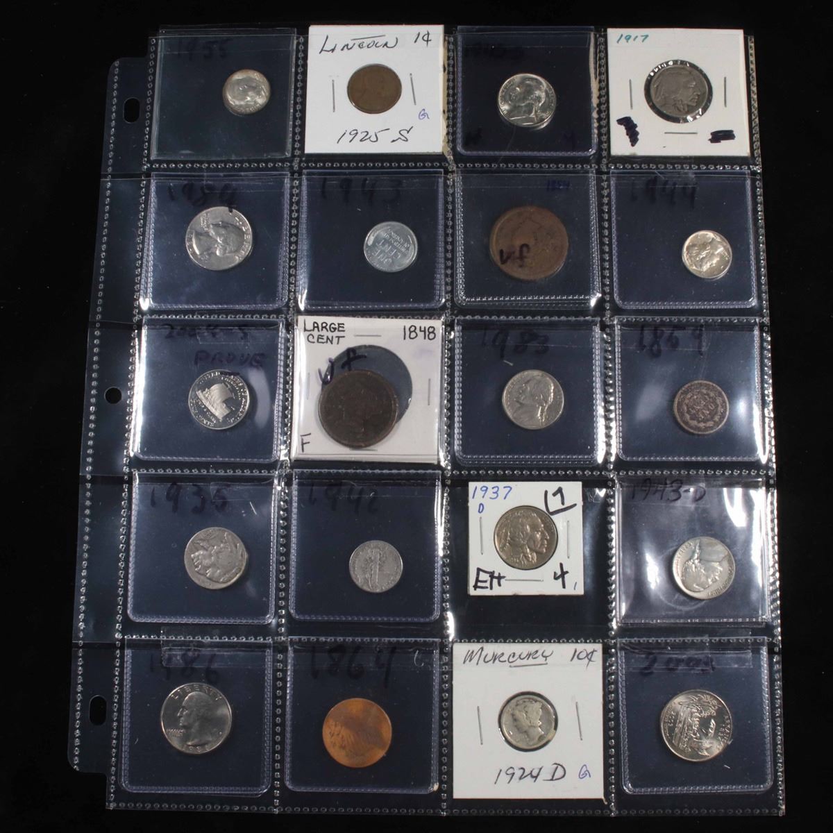 Page of 20 Mixed coins Barber 10c, Braided Hair 1c, Washington 25c, Roosevelt 10c, Buffalo 5c, Jefferson 5c. A nice page of a wide variety of 20 coins. This page includes 1955-p Roosevelt Dime, 1925-s Lincoln cent, 1945-s Jefferson Nickel, 1917-p Buffalo Nickel, 1984-p Washington quarter, 1943-p Steel Lincoln cent, 1854 Braided Hair Cent, 1944-p Mercury Dime, 2004-s Proof Jefferson Nickel, 1848 Braided Hair cent, 1983-p Jefferson Nickel, 1854 Indian cent, 1935-p Buffalo Nickel, 1942-p Mercury Dime, 1937-d Buffalo Nickel, 1943-d Jefferson Nickel, 1986-p Washington Quarter, 1864 2c, 1924-d Mercury dime, and a 2003-p Washington Quarter.