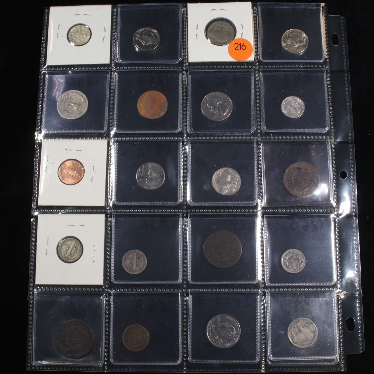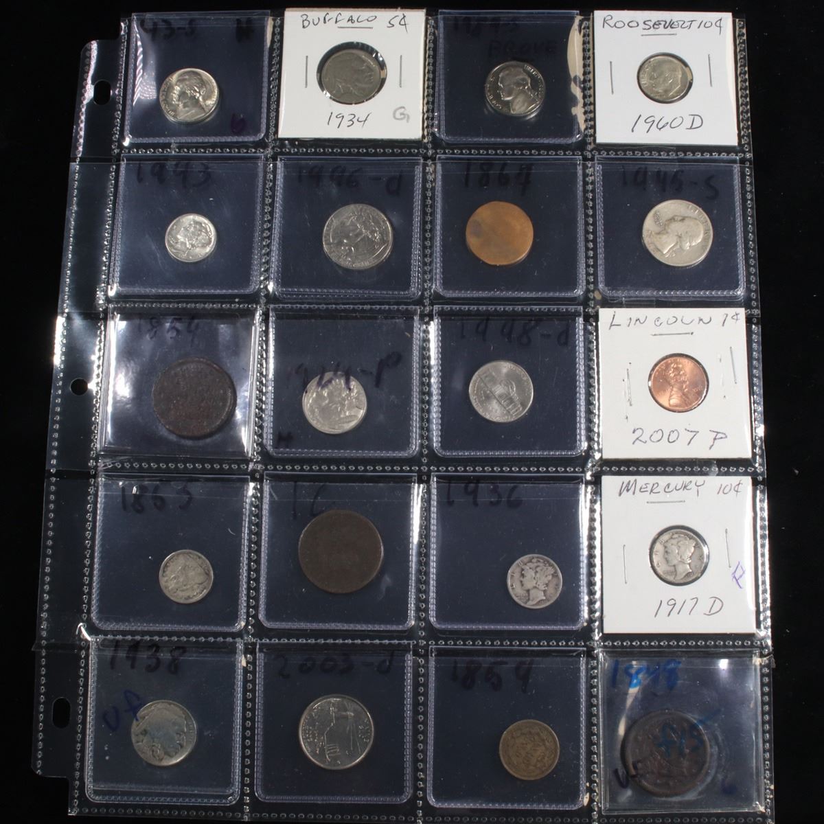 Page of 20 Mixed coins Buffalo 5c, Braided Hair 1c, Washington 25c, Mercury 10c, Indian 1c, Jefferso