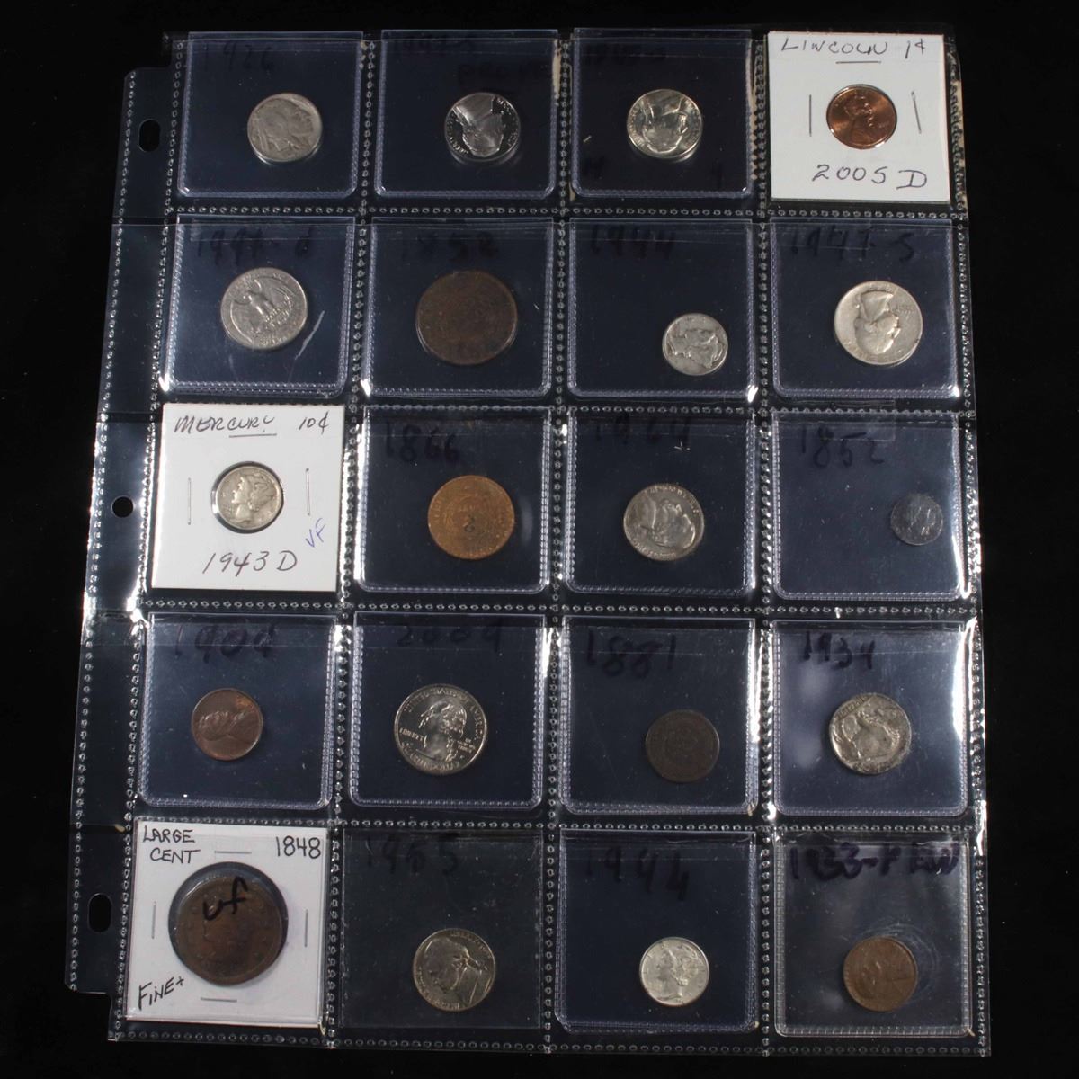 Page of 20 Mixed coins Buffalo 5c, Braided Hair 1c, Washington 25c, Mercury 10c, Indian 1c, Jefferson 5c. A nice page of a wide variety of 20 coins. This page includes 1926-p Buffalo Nickel, 1997-s Proof Jefferson Nickel, 1945-s Jefferson Nickel, 2005-d Lincoln cent, 1997-d Washington Quarter, 1852 Braided Hair Cent, 1944-p Mercury dime, 1947-s Washington Quarter, 1943-d Mercury Dime, 1866 2c, 1964-p Jefferson Nickel, 1852 3cn, 1909-p Lincoln Cent, 2009-p Washington Quarter, 1881 Indian cent, 1934-p Buffalo Nickel, 1848 Braided Hair, 1955-p Jefferson Nickel, 1944-p Mercury dime, and 1933-p Lincoln cent
