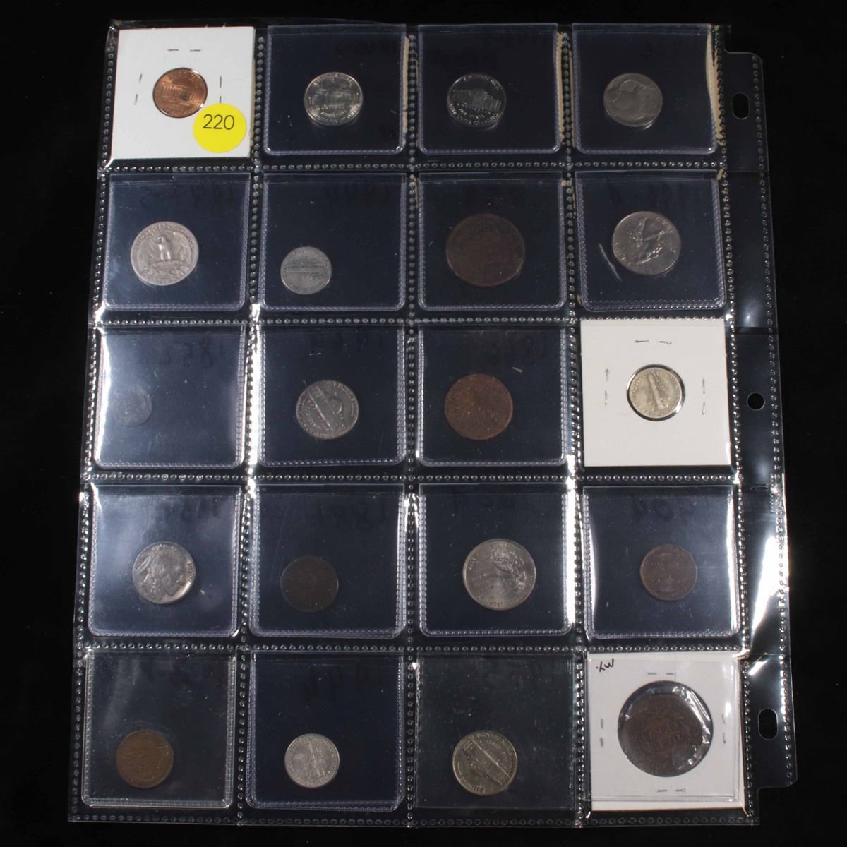 Page of 20 Mixed coins Buffalo 5c, Braided Hair 1c, Washington 25c, Mercury 10c, Indian 1c, Jefferso