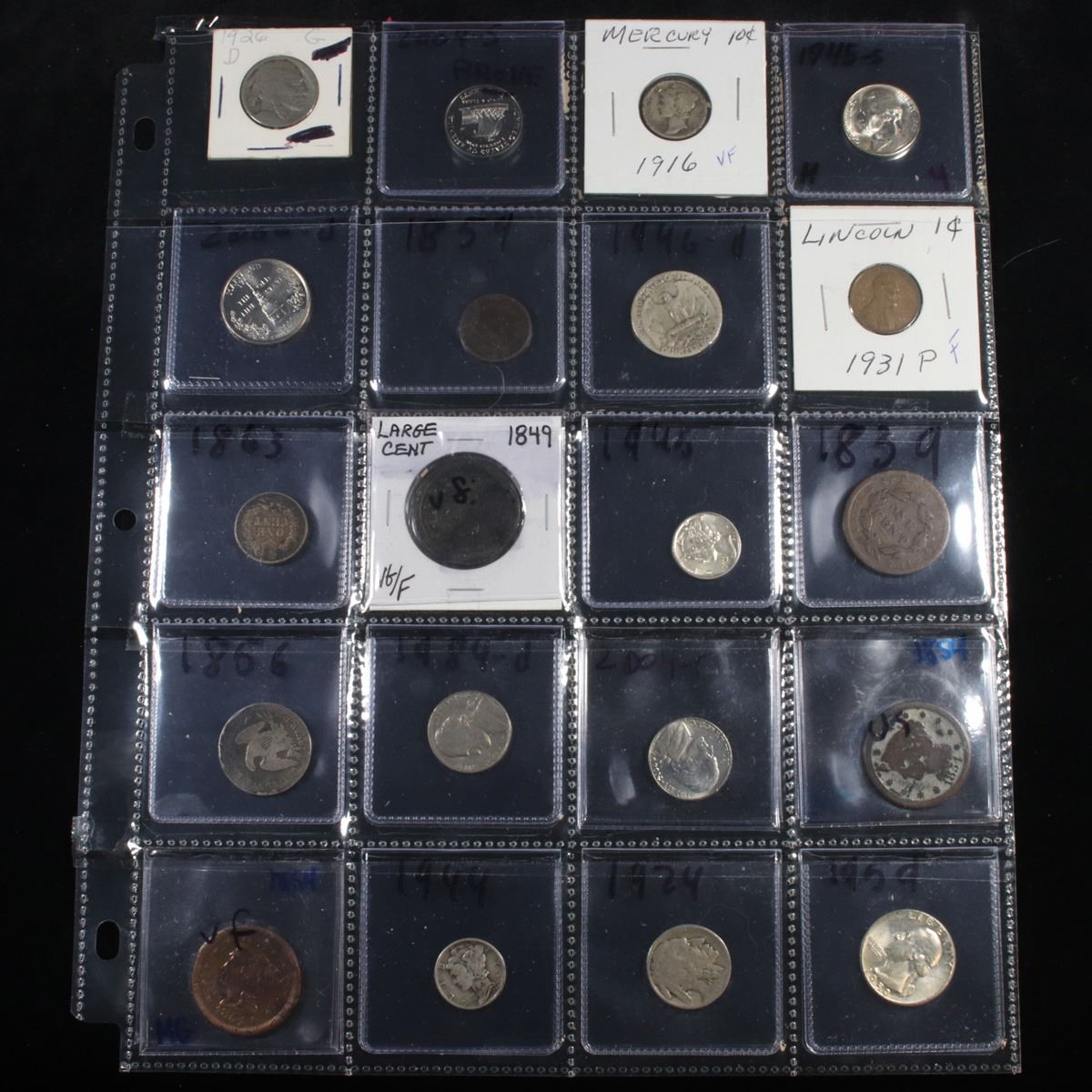 Page of 20 Mixed coins Buffalo 5c, Braided Hair 1c, Washington 25c, Mercury 10c, Indian 1c, Jefferson 5c. A nice page of a wide variety of 20 coins. This page includes 1926-d Buffalo Nickel, 2004-s Proof Jefferson Nickel, 1916-p Mercury dime, 1945-s Jefferson Nickel, 2000-d Washington Quarter, 1859 Indian cent, 1946-d Washington Quarter, 1931-p Lincoln cent, 1863 Indian cent, 1849 Braided Hair cent, 1945-p Mercury Dime, 1839 Braided Hair cent, 1856-p Seated Liberty Quarter, 1984-d Jefferson Nickel, 2004-p Jefferson nickel, 1854 Braided Hair, 1854 Braided Hair cent, 1944-p Mercury Dime, 1924-p Buffalo Nickel, and 1959-p Washington Quarter.