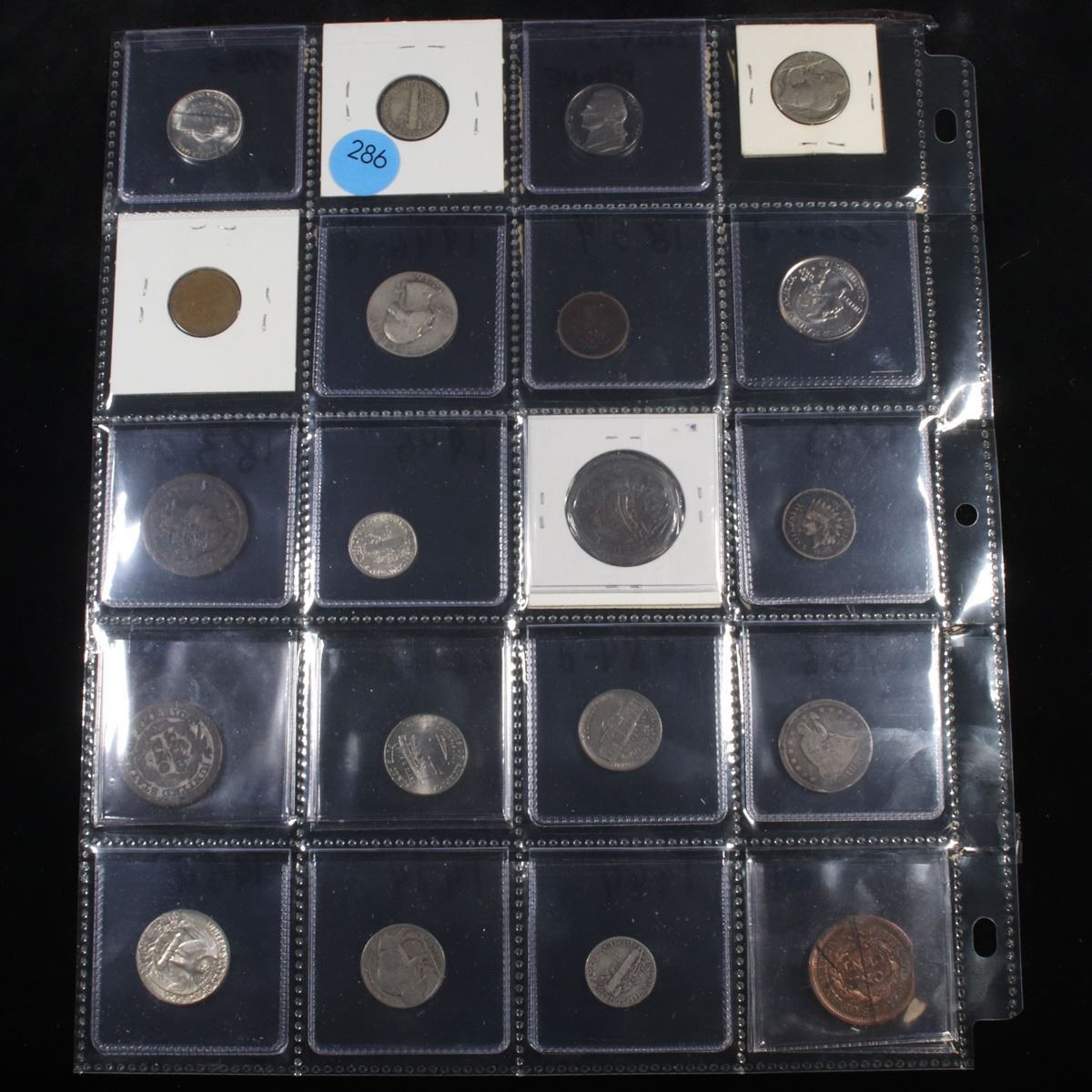 Page of 20 Mixed coins Buffalo 5c, Braided Hair 1c, Washington 25c, Mercury 10c, Indian 1c, Jefferso
