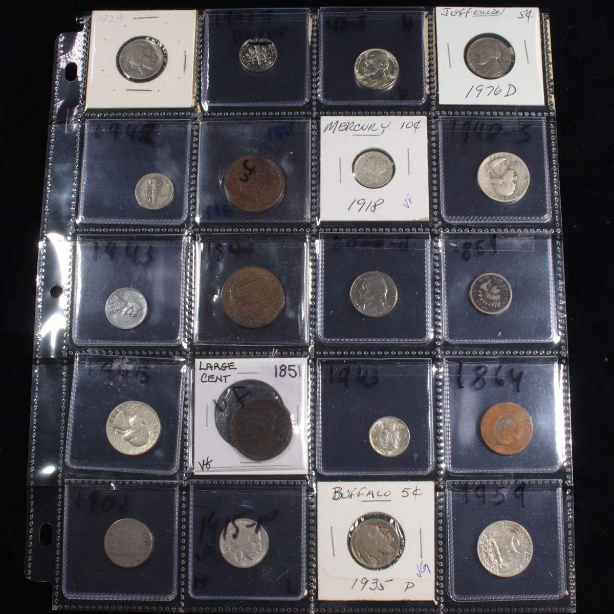 Page of 20 Mixed coins Jefferson 5c, Braided Hair 1c, Washington 25c, Liberty 5c, Indian 1c, Lincoln 1c. A nice page of a wide variety of 20 coins. This page includes 1929-p Buffalo Nickel, 1993-s Proof Roosevelt Dime, 1943-s Jefferson Nickel, 1976-d Jefferson Nickel, 1942-p Mercury Dime, 1851 Braided Hair Cent, 1918-p Mercury Dime, 1948-s, 1943-p Steel Lincoln Cent, 1844 Half Penny, 2000-d Jefferson Nickel, 1859 Indian Cent, 1955-p Washington Quarter, 1851 Braided Hair Cent, 1943-p Mercury Dime, 1864 2c, 1902 Liberty Nickel, 1915-p Buffalo Nickel, 1935-p Buffalo Nickel, and 1959-p Washington Quarter