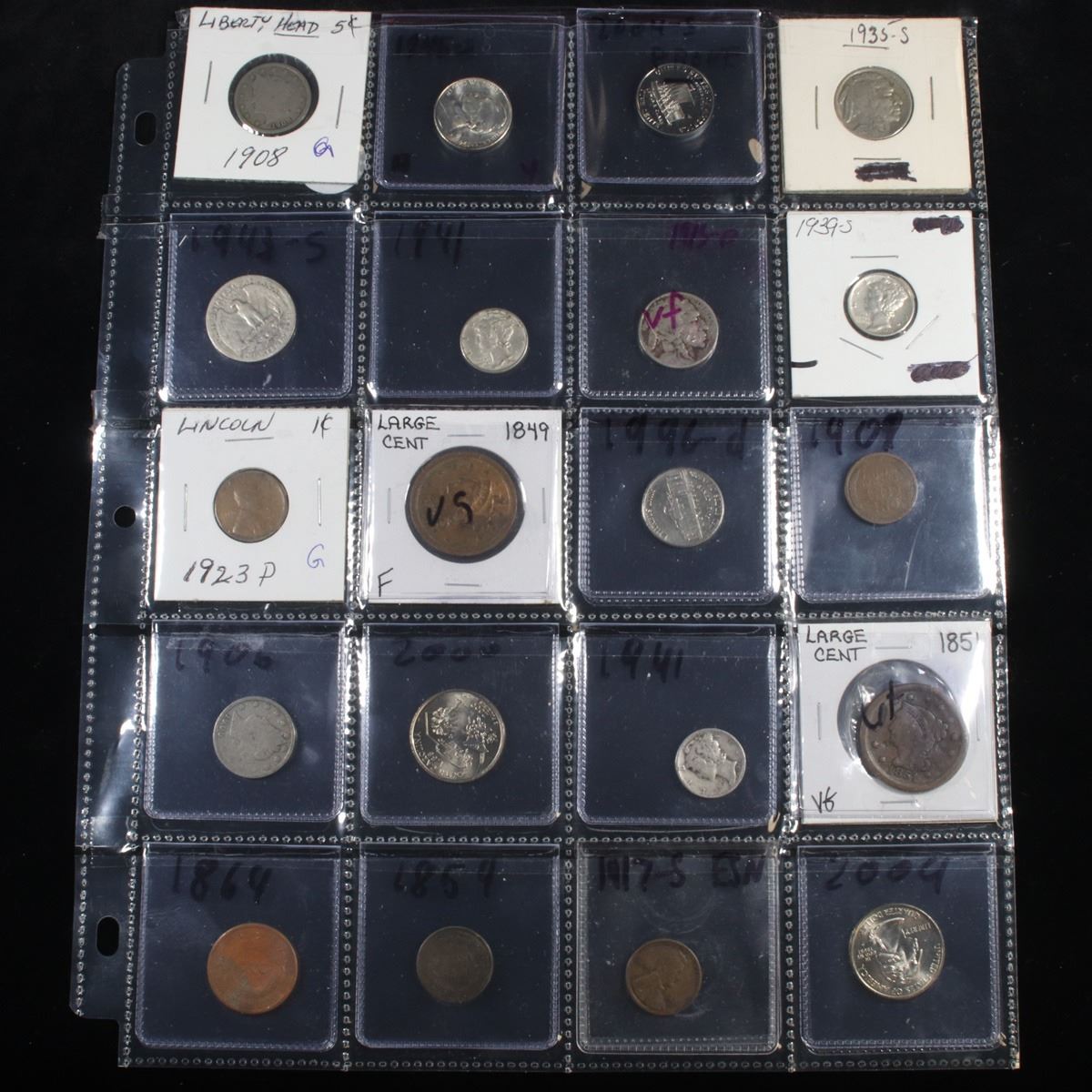 Page of 20 Mixed coins Jefferson 5c, Braided Hair 1c, Washington 25c, Mercury 10c, Indian 1c, Liberty 5c. A nice page of a wide variety of 20 coins. This page includes 1908 Liberty Nickel, 1945-s Jefferson Nickel, 2004-s Proof Jefferson Nickel, 1935-s Buffalo Nickel, 1943-s Washington Quarter, 1941-p Mercury dime, 1913-d Buffalo Nickel, 1939-s Mercury dime, 1923-d Lincoln cent, 1849 Braided hair cent, 1996-d Jefferson Nickel, 1909-p Lincoln cent, 1906 Liberty Nickel, 2000-p Washington Quarter, 1941-p Mercury Dime, 1851 Braided Hair cent, 1864 2c, 1859 Indian cent, 1917-s Lincoln cent, and 2004-p Washington Quarter.