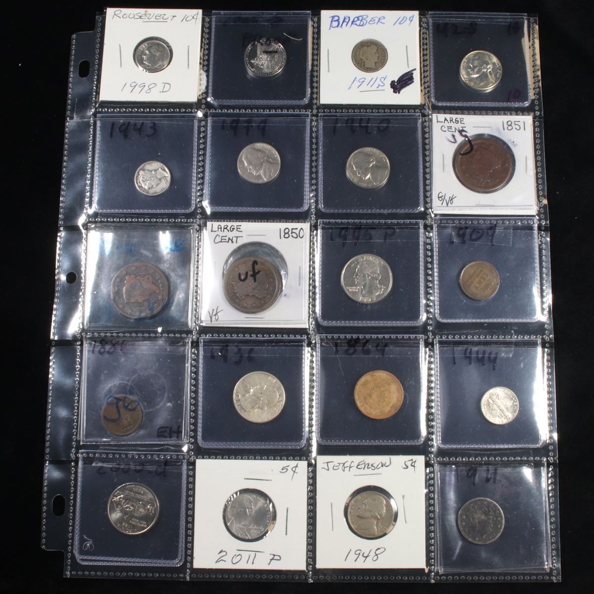 Page of 20 Mixed coins Liberty 5c, Braided Hair 1c, Washington 25c, Roosevelt 10c, Indian 1c, Jefferson 5c. A nice page of a wide variety of 20 coins. This page includes 1998-d Roosevelt Dime, 2005-d Proof Jefferson Nickel, 1911-s Barber Dime, 1942-s Jefferson, 1943-p Mercury Dime, 1979-p Jefferson Nickel, 1940-p Jefferson Nickel, 1851 Braided Hair, 1824 Coronet Head, 1850 Braided Hair, 1995-p Washington Quarter, 1909-p Lincoln Cent, 1886 Indian Cent, 1936-p Washington Quarter, 1864 2c, 1944-p Mercury Dime,2000-d Washington Quarter, 2011-p Jefferson Nickel, 1948-p Jefferson Nickel, and 1911 Liberty Nickel.