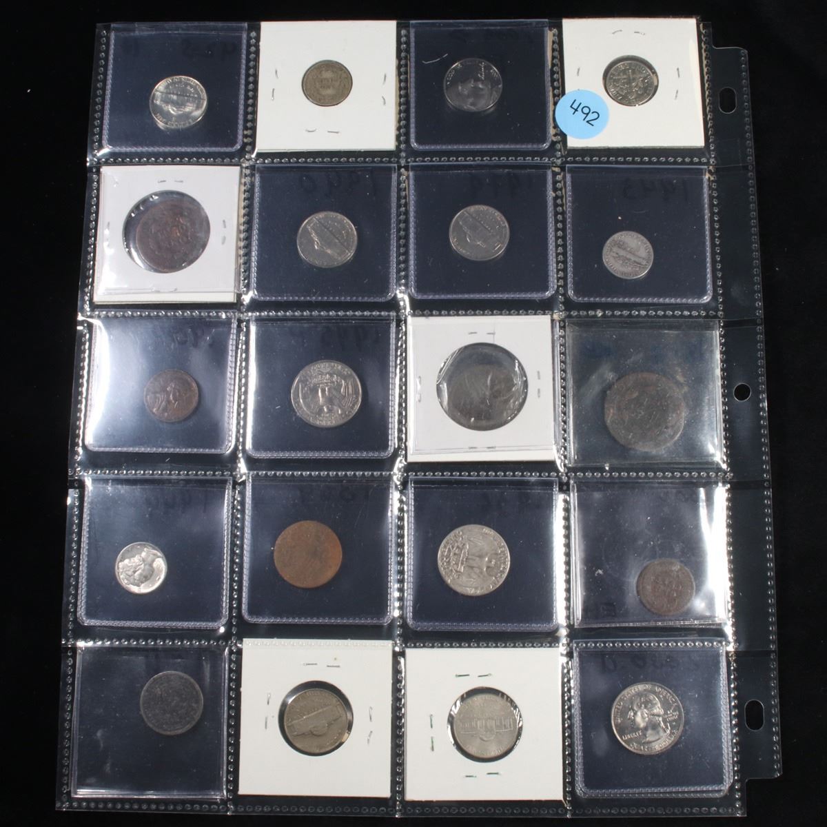 Page of 20 Mixed coins Liberty 5c, Braided Hair 1c, Washington 25c, Roosevelt 10c, Indian 1c, Jeffer