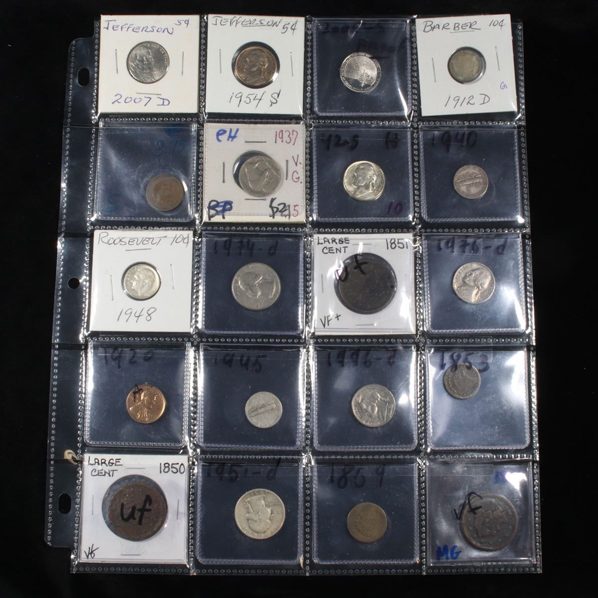 Page of 20 Mixed coins Mercury 10c, Braided Hair 1c, Washington 25c, Barber 10c, Indian 1c, Jefferson 5c. A nice page of a wide variety of 20 coins. This page includes 2007-d Jefferson Nickel, 1954-s Jefferson Nickel, 2005-s Proof Jefferson Nickel, 1912-d Barber Dime, 1911-d Lincoln cent, 1937-p Buffalo Nickel, 1942-p Jefferson Nickel, 1940-p Mercury Dime, 1948-p Roosevelt Dime, 1974-d Washington Quarter, 1851 Braided Hair, 1976-d Jefferson Nickel, 1920-p Lincoln cent, 1945-p Mercury dime, 1996-d Jefferson Nickel, 1853-p Seated Liberty Dime, 1850 Braided Hair, 1951-d Washington quarter, 1859 Indian cent, and 1851 Braided Hair.