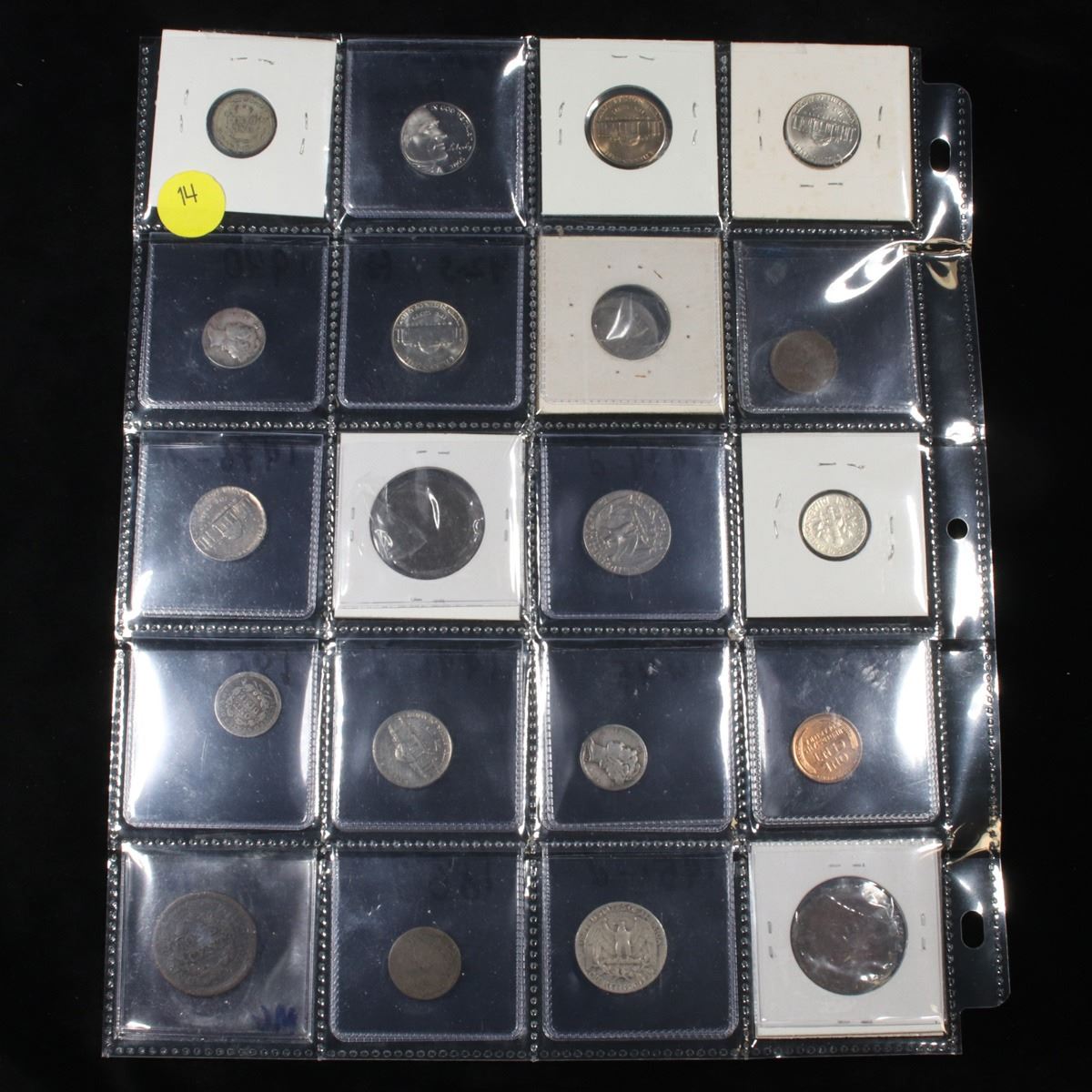 Page of 20 Mixed coins Mercury 10c, Braided Hair 1c, Washington 25c, Barber 10c, Indian 1c, Jefferso
