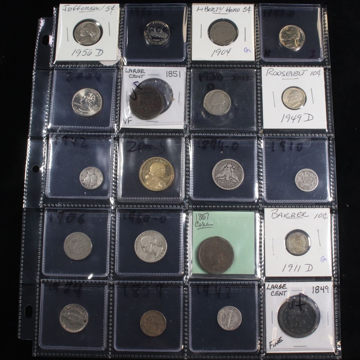 Page of 20 Mixed coins Mercury 10c, Braided Hair 1c, Washington 25c, Jefferson 5c, Indian 1c, Liberty 5c. A nice page of a wide variety of 20 coins. This page includes 1956-d Jefferson Nickel, 1996-s Proof Jefferson Nickel, 1904 Liberty Nickel, 1943-d Jefferson Nickel, 2006-d Washingtin Quarter, 1851 Braided Hair, 1938-d Jefferson Nickel, 1949-d Roosevelt Dime, 1942-p Mercury Dime, 2000-s Sacagewea Dollar, 1894-o Barber Quarter, 1910-p Barber Dime, 1906 Liberty Nickel, 1960-d Washington Quarter, 1851 Braided Hair, 1911-d Barber Dime, 1984-p Jefferson Nickel, 1859 Indian cent, 1942-p Mercury Dime, and 1849 Braided Hair cent.