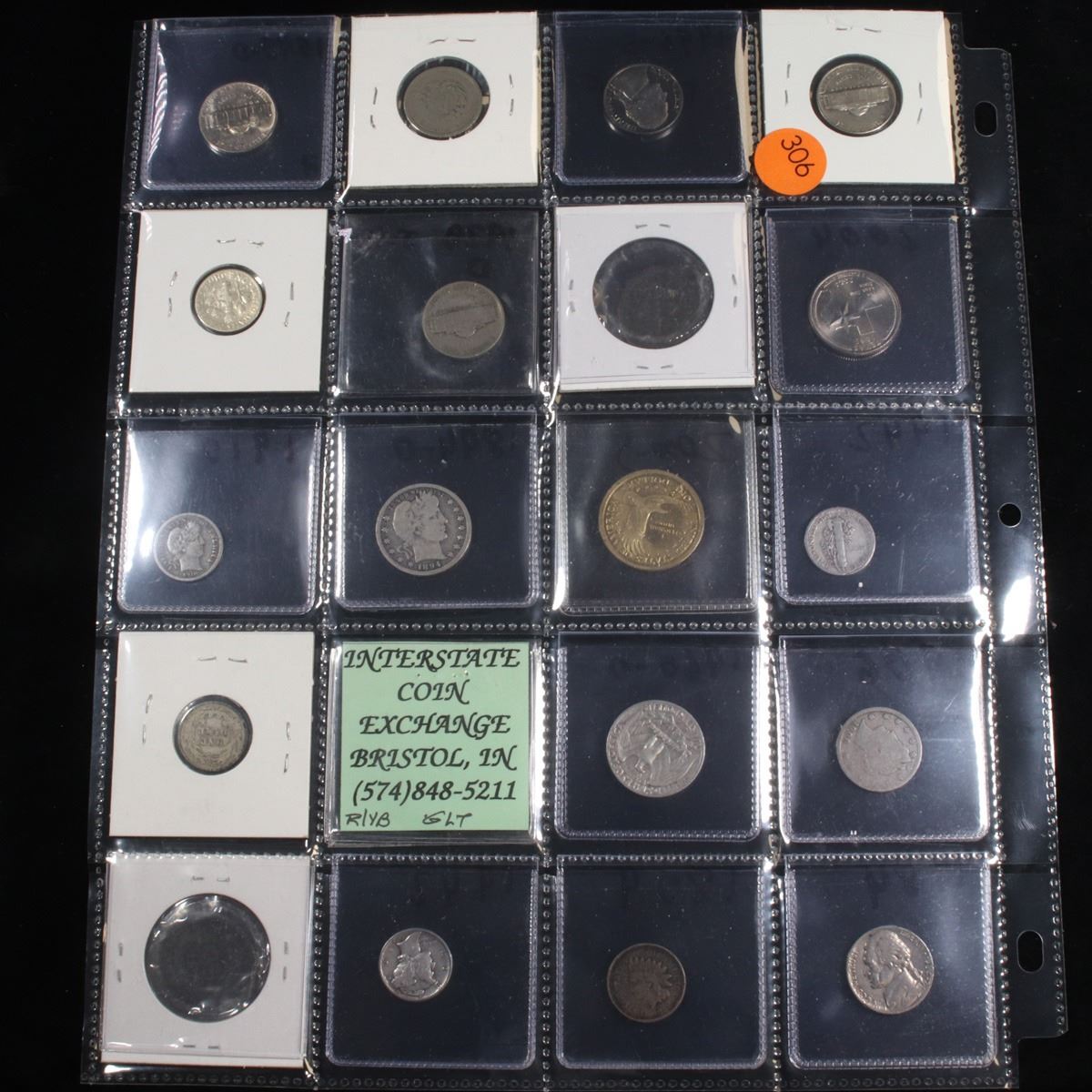 Page of 20 Mixed coins Mercury 10c, Braided Hair 1c, Washington 25c, Jefferson 5c, Indian 1c, Libert
