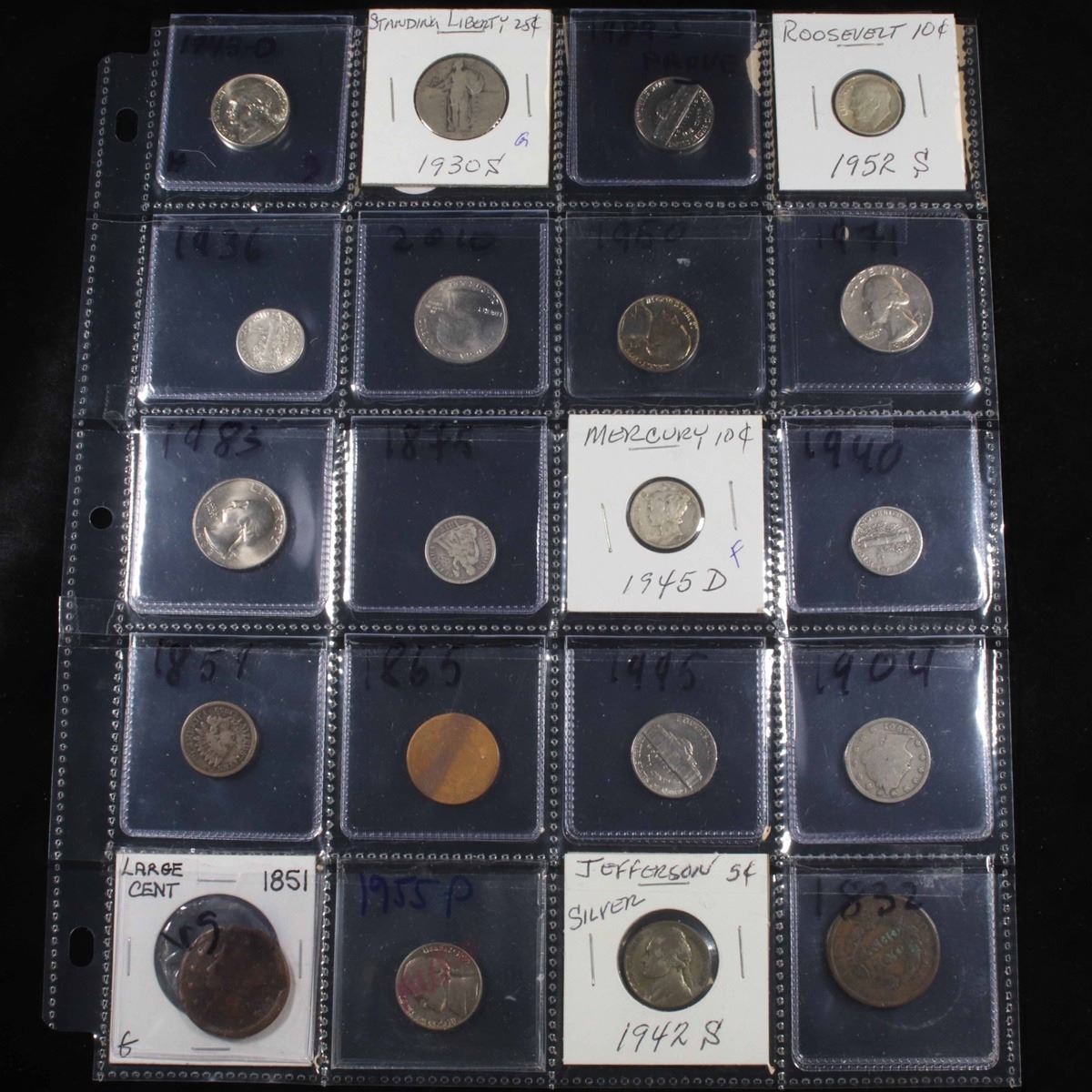 Page of 20 Mixed coins Mercury 10c, Braided Hair 1c, Washington 25c, Jefferson 5c, Indian 1c, Liberty 5c. A nice page of a wide variety of 20 coins. This page includes 1943-d Jefferson Nickel, 1930-s Standing Liberty uarter, 1989-s Jefferson Nickel, 1952-s Roosevelt Dime, 1936-p Mercury dime, 2010-p Washington Quarter, 1950-p Jefferson Nickel, 1971-p Washington Quarter,1983-p Washington quarter, 1875-p Seated Liberty Dime, 1945-d Mercury dime, 1940-p Mercury dime, 1859 Indian cent, 1865 2c, 1995-p Jefferson Nickel, 1904 Liberty Nickel, 1851 Braided Hair cent, 1955-p Jefferson Nickel, 1942-s Jefferson nickel, and 1832 Coronet head.