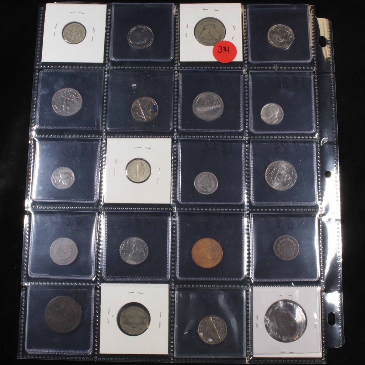 Page of 20 Mixed coins Mercury 10c, Braided Hair 1c, Washington 25c, Jefferson 5c, Indian 1c, Libert