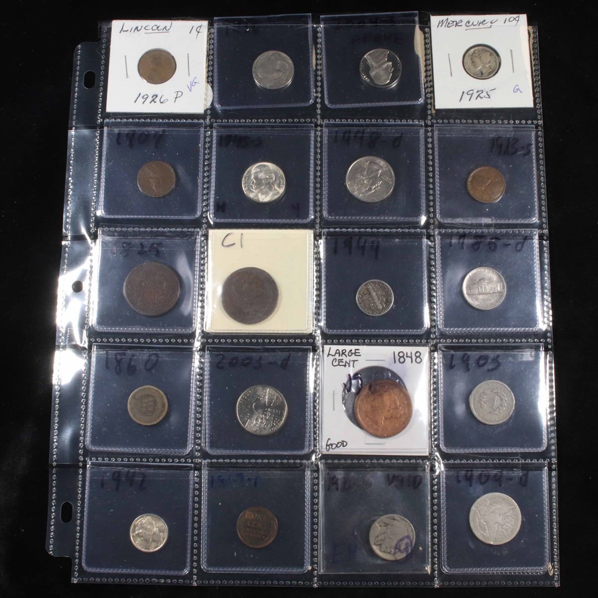 Page of 20 Mixed coins Mercury 10c, Braided Hair 1c, Washington 25c, Jefferson 5c, Indian 1c, Liberty 5c. A nice page of a wide variety of 20 coins. This page includes 1926-p Lincoln cent, 1936-p Buffalo Nickel, 2004-s Proof Jeffersion Nickel, 1925-p Mercury Dime, 1909-p Lincoln cent, 1945-s Jefferson Nickel, 1998-d Washington Quarter, 1923-s Lincoln cent, 1825 Coronet Head cent, No Date Large cent, 1944-p Mercury dime, 1985-d Jefferson nickel, 1860 Indian cent, 2003-d Washington Quarter, 1848 Braided Hair cent, 1903 Liberty Nickel, 1942-p Mercury dime, 1929-p Lincoln cent, 1925-s Buffalo Nickel, and 1909-d Barber Quarter.